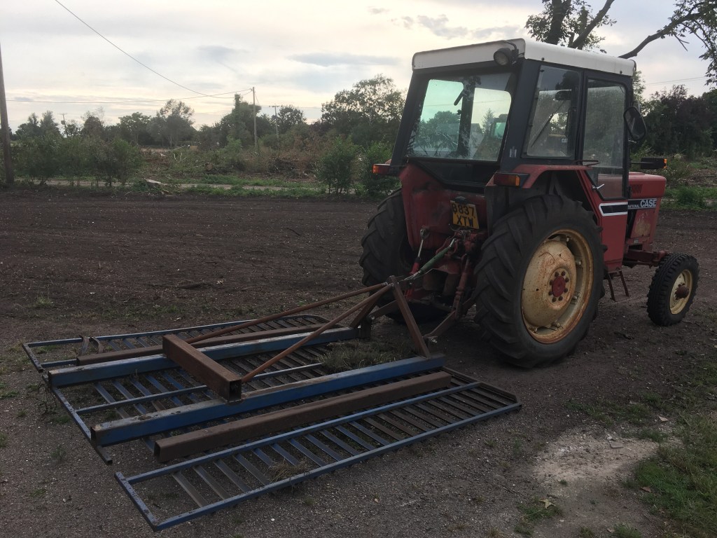 Once fifty years of growth had been removed, all the tree stumps either burnt or ground out, this left a very uneven garden . To resolve this the company that had done the major ground clearance work, welded together an old gate and some angle iron they had at the yard.The result was the leveller you see on the back of the tractor. It did a fantastic job to level nearly two acres. After a few months the grass has grown back and it’s fine to run a lawnmower over. Job well done by them.