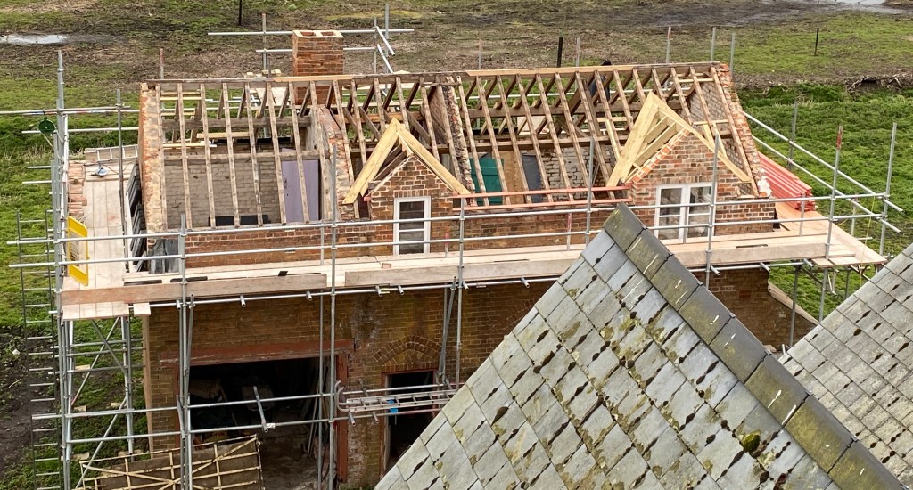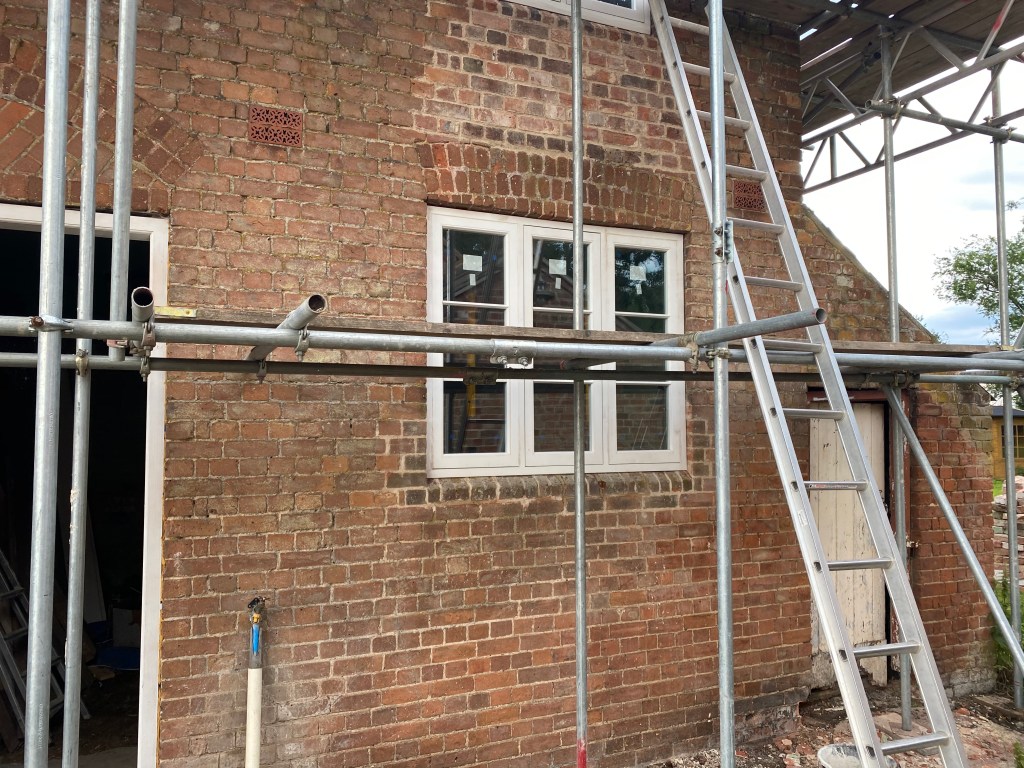 The last jobs for the external appearance are the gutters to be fitted, the new windows and French door for the old cart room are being made. that will make the building wind and rain proof. You’ll notice that the lean-to on the right hand side has not been touched yet. This will be taken down later in the year and enlarged to create the jacuzzi and sauna room.