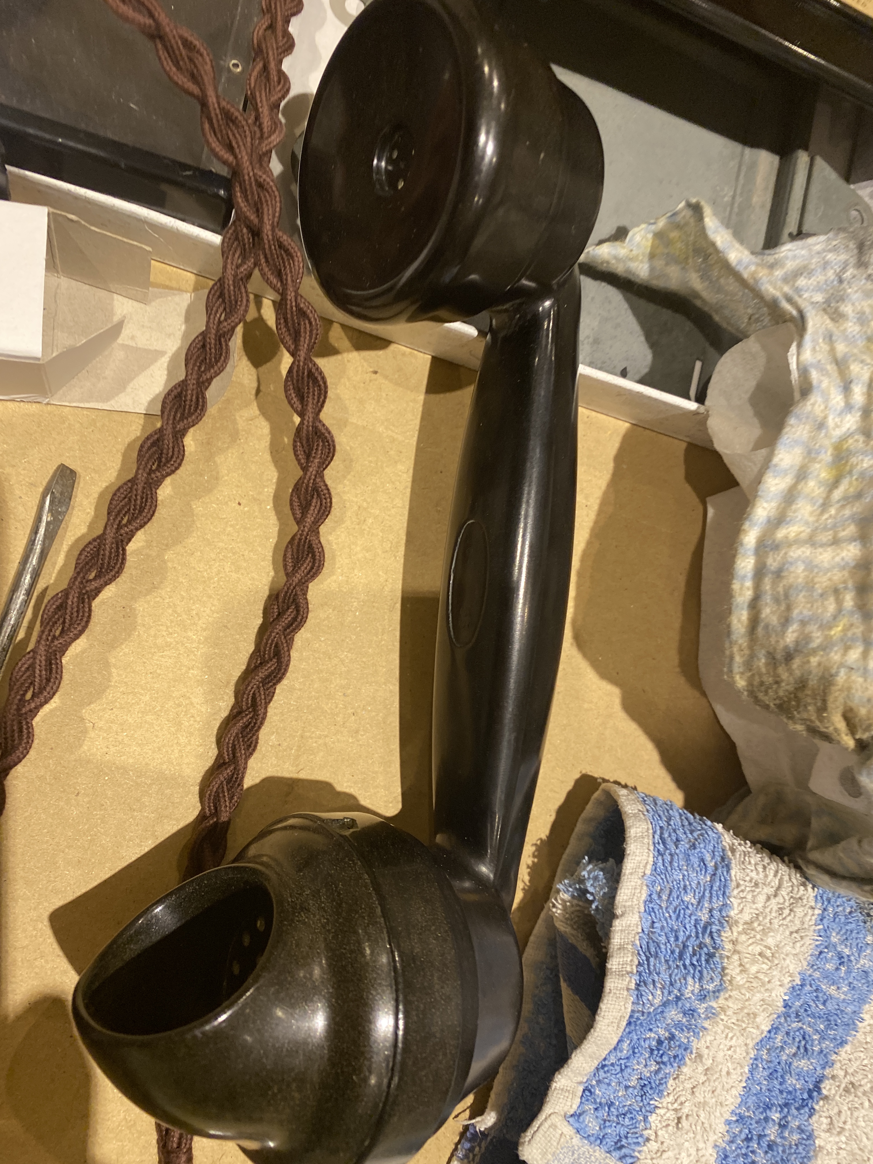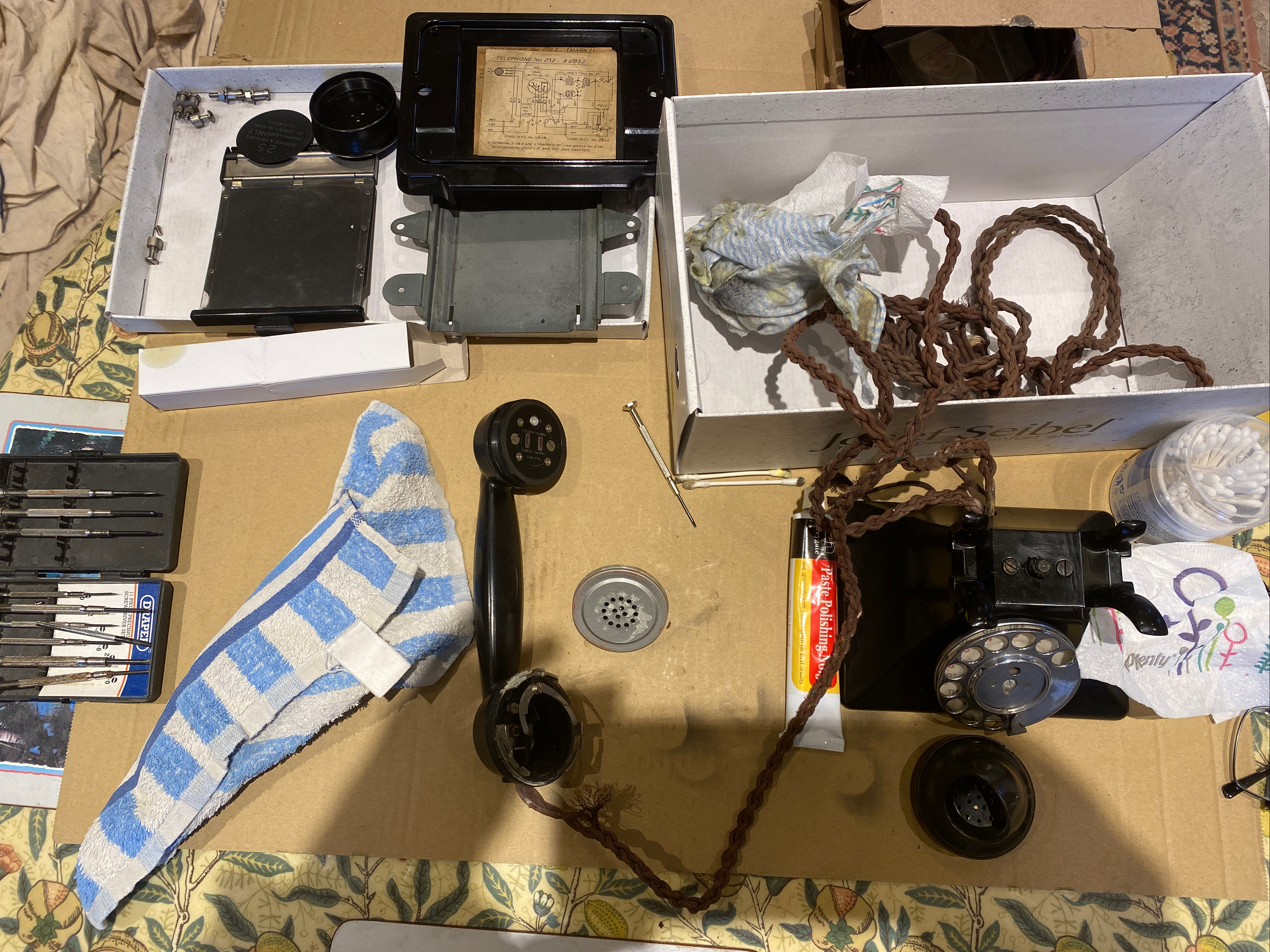 - A tube of No. 5 polishing paste. This paste is reputed to be the same as used by GPO engineers to clean these phones. I didn’t find the result to be fantastic, even with an hour or two of elbow grease. I was tempted to get the dremel out, to see how far I could buff the bakelite. However, I did not, as the phone is serviceable and still bears its worn aged look which is how I intended it to look.