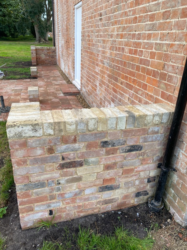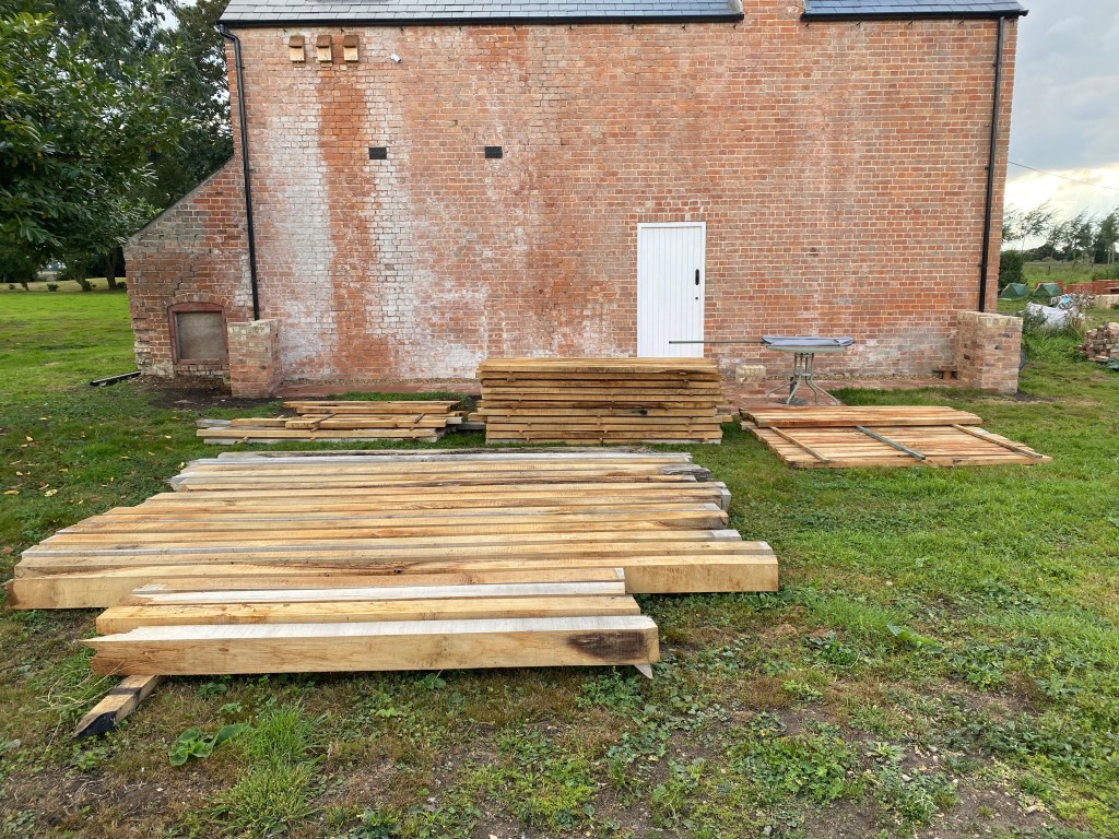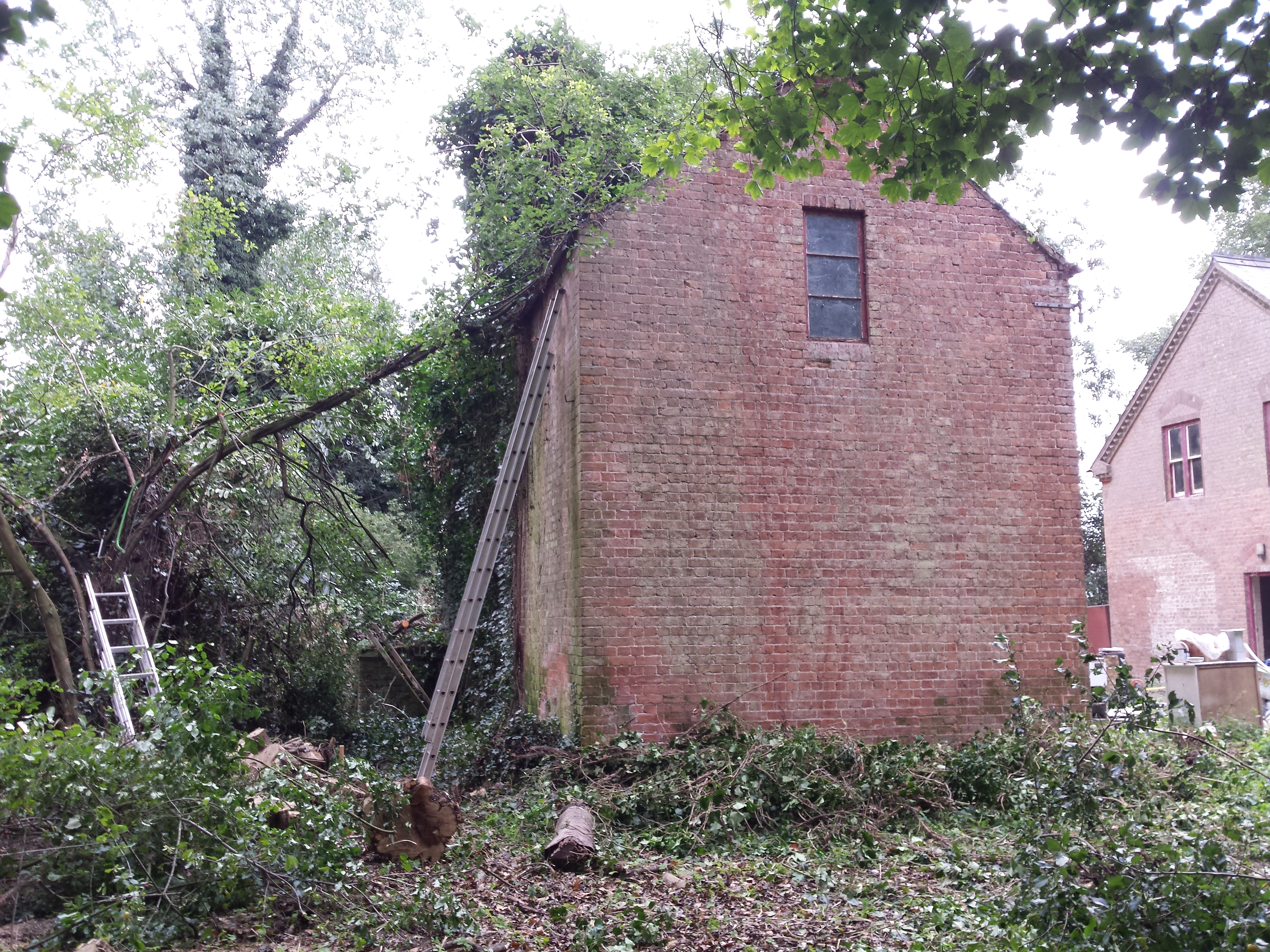 Work underway to clear fifty years of ivy The brick walls and red tile floor were all materials reclaimed from the house. Just waiting for the porch structure to be built on topAll of the oak is from a tree in the grounds that blew down in the storm last year. It was sawn in situ by a mobile log sawing company. Its use in the creation of the structure on top of the brick walls and piers will commence shortly.
