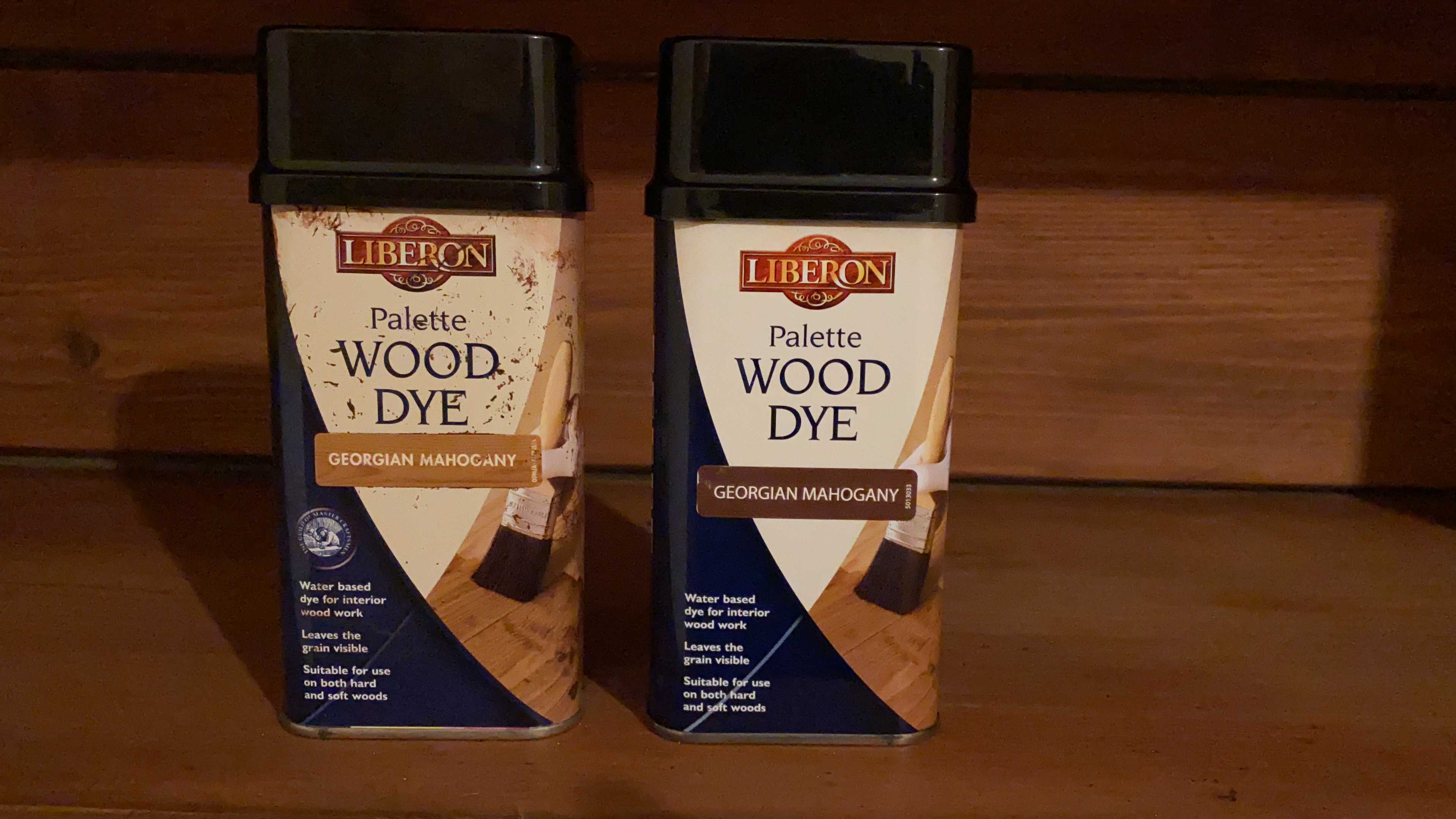 Both tins have the same darker colour, as per the tin on the right, as would be expected for Georgian Mahogany.