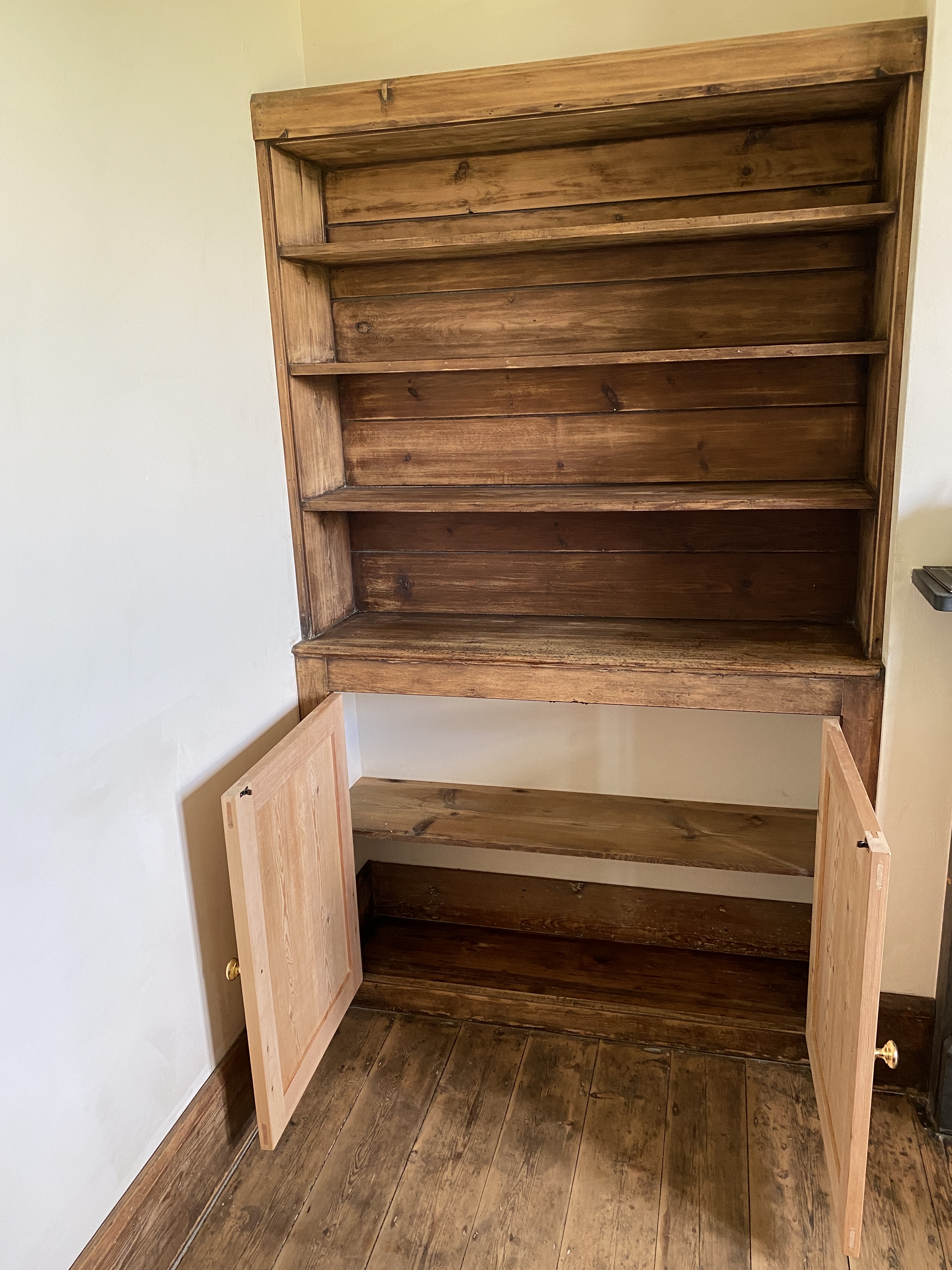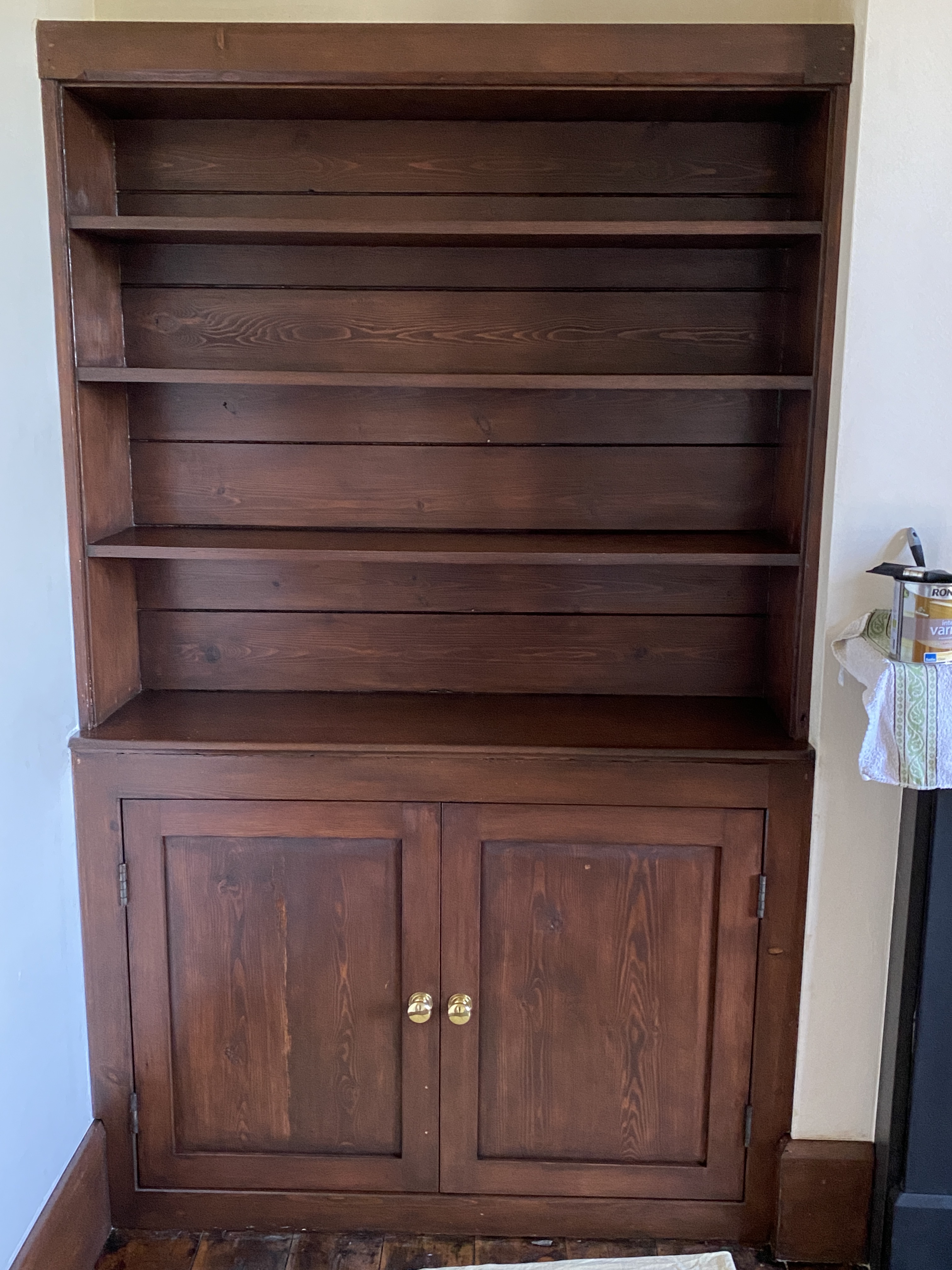 The unit was stripped back to bare wood and repairs carried out (several pieces were missing such as doors and an internal shelf and floor). Note the doors are new, made from reclaimed wood from the house. The reason the wood colour of the doors looks different, is that the wood needed to be reduced in thickness. Whereas, the remainder of the cabinet was stripped and lightly sanded, before being stained back to its original colour, a dark mahogany with only a hint of red. To achieve this, a Georgian mahogany was found to be the closest match. Two coats were applied and then a clear satin varnish to seal.