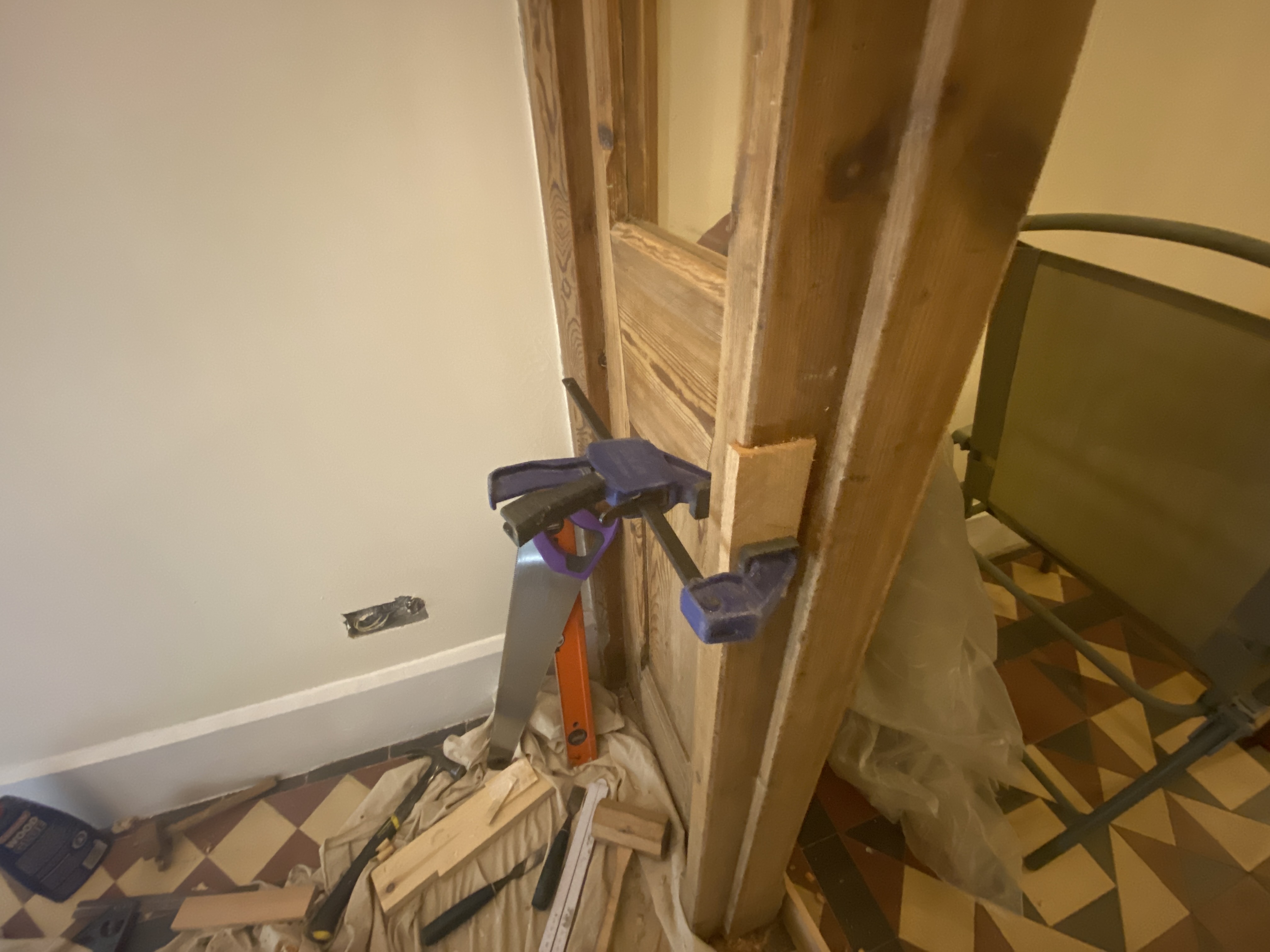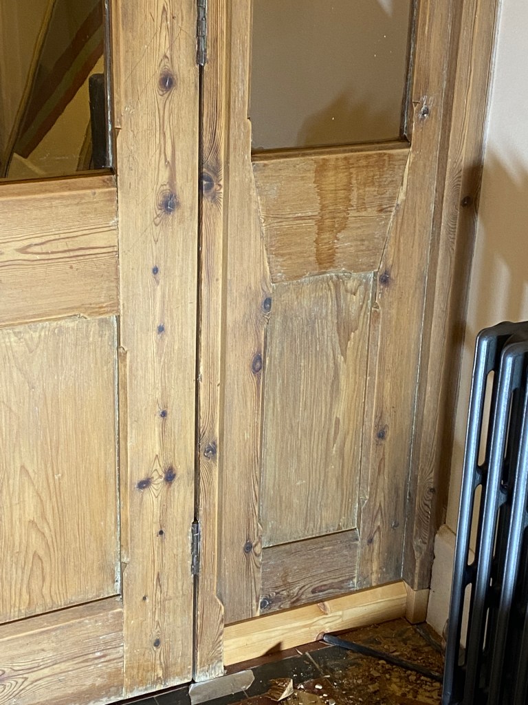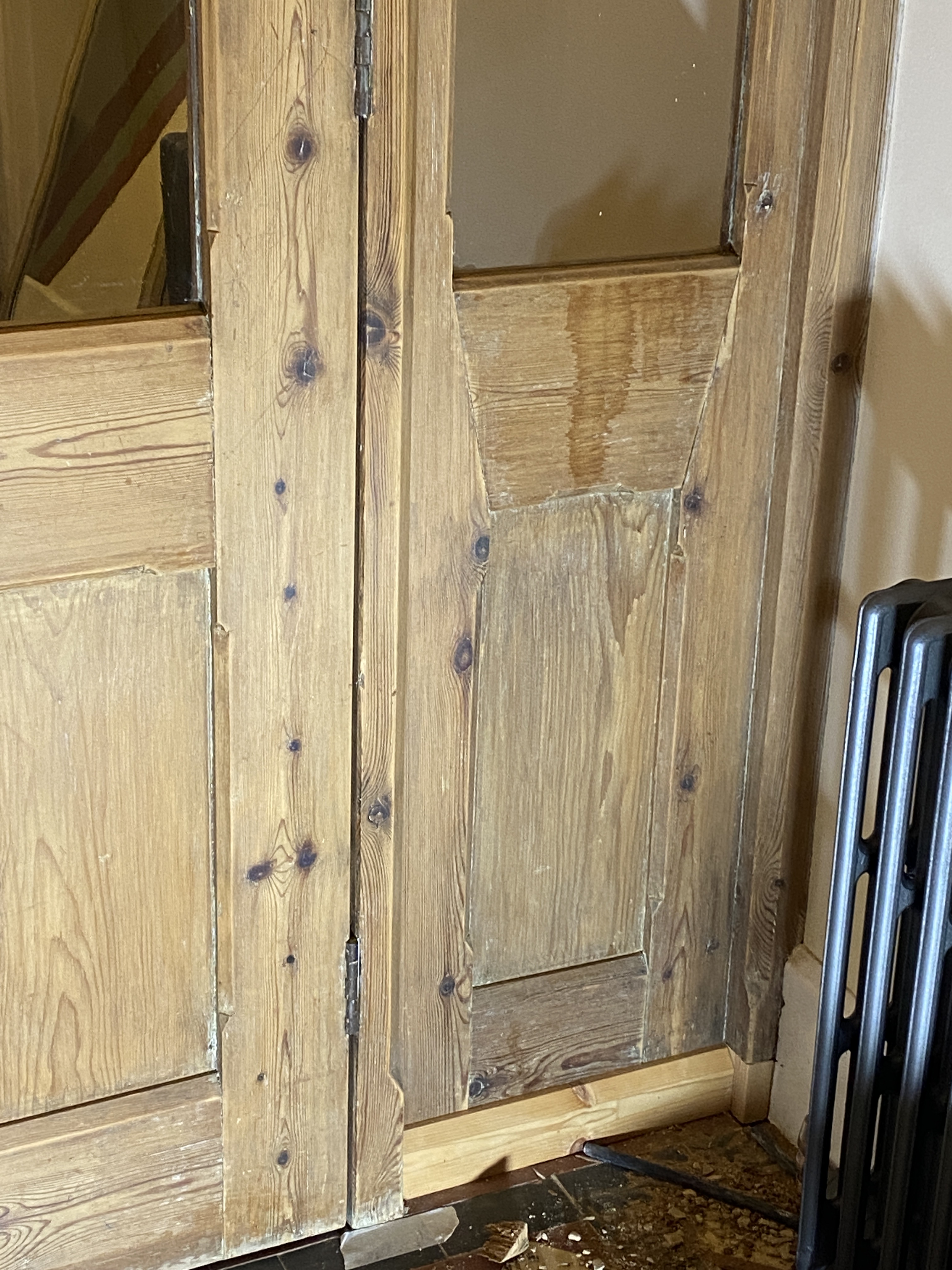 Before work commenced the door and its partition were hand stripped with a shave hook then sanded. The modern lock that had been cut into the door was removed and this area block filled. Similarly the latch in the partition was filled, and then a sharp plane used to shave to the correct fit. All other damage in the door was rectified.