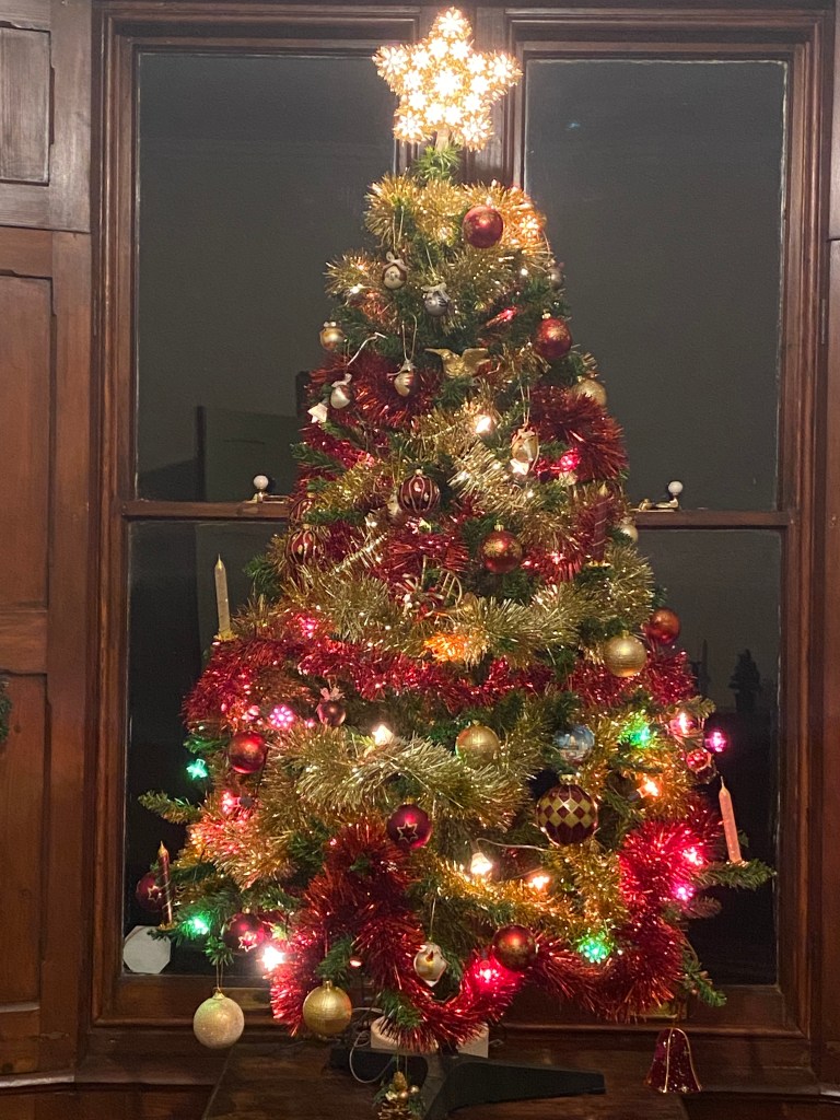 As the dining room is nearing completion, we thought it was high time to dust off the artificial Christmas tree. The tree is over twenty-five years old now and has moved with us from home-to-house. It is only five-foot high, so we have stood it on an old Sobell radiogram. From the outside, it gives the illusion of being much larger.