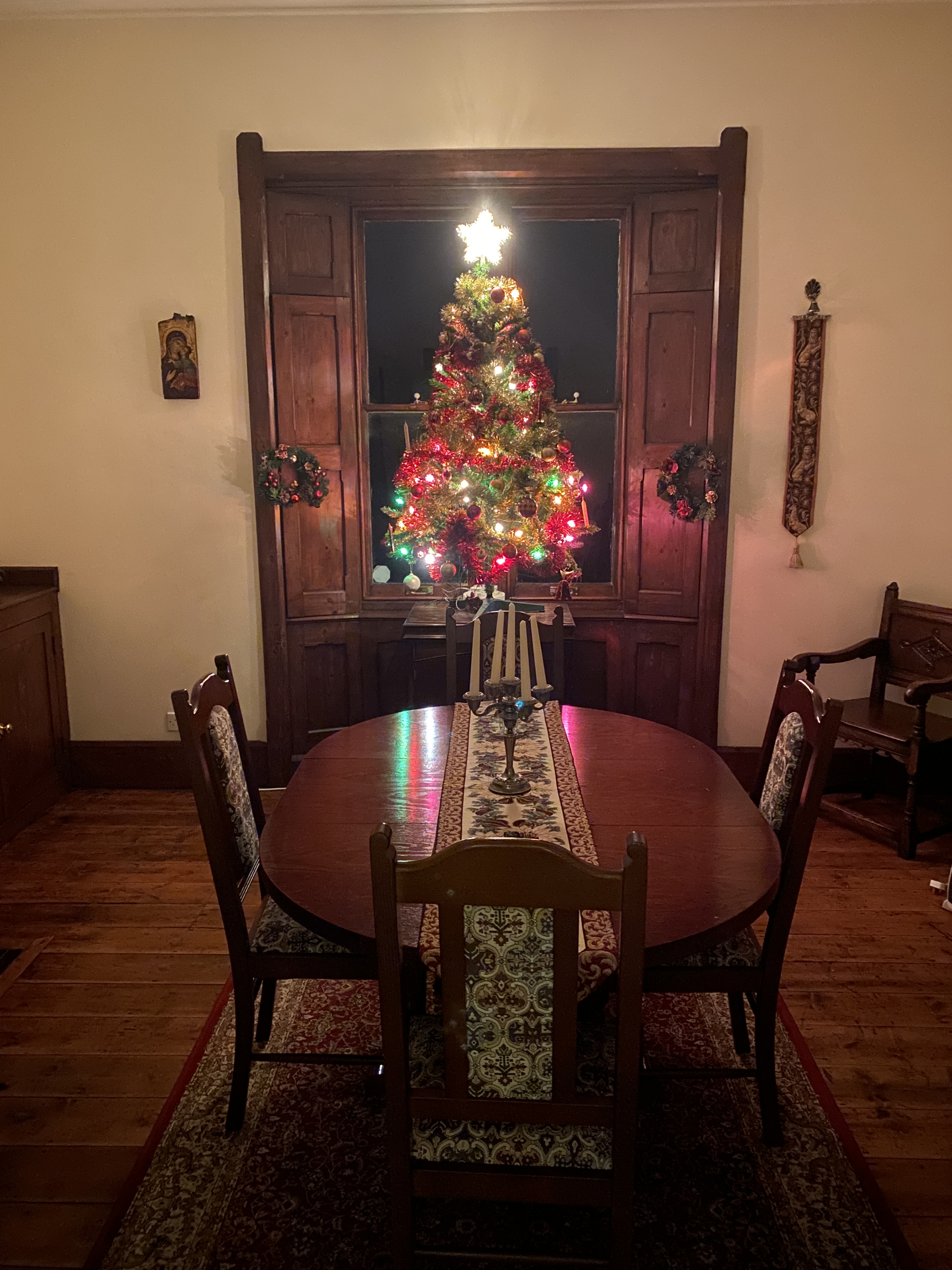 As the dining room is nearing completion, we thought it was high time to dust off the artificial Christmas tree. The tree is over twenty-five years old now and has moved with us from home-to-house. It is only five-foot high, so we have stood it on an old Sobell radiogram. From the outside, it gives the illusion of being much larger.