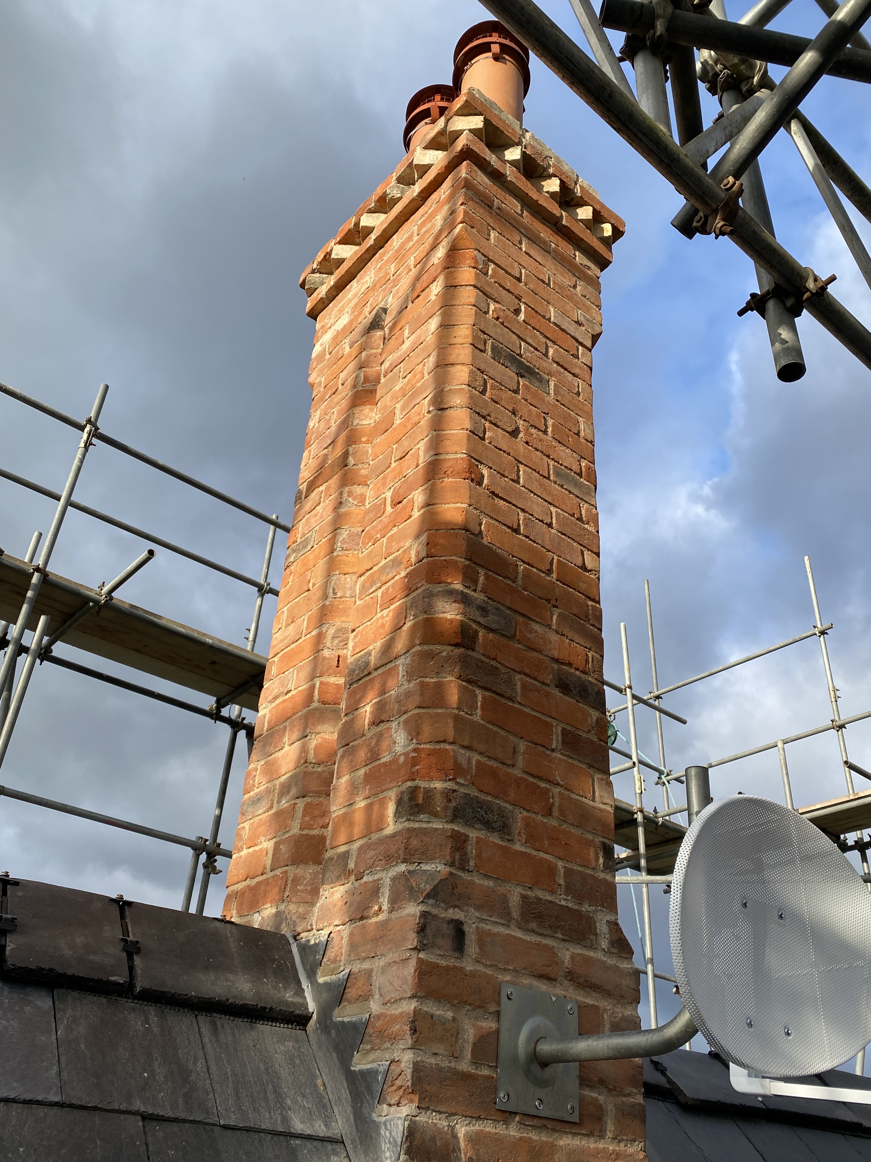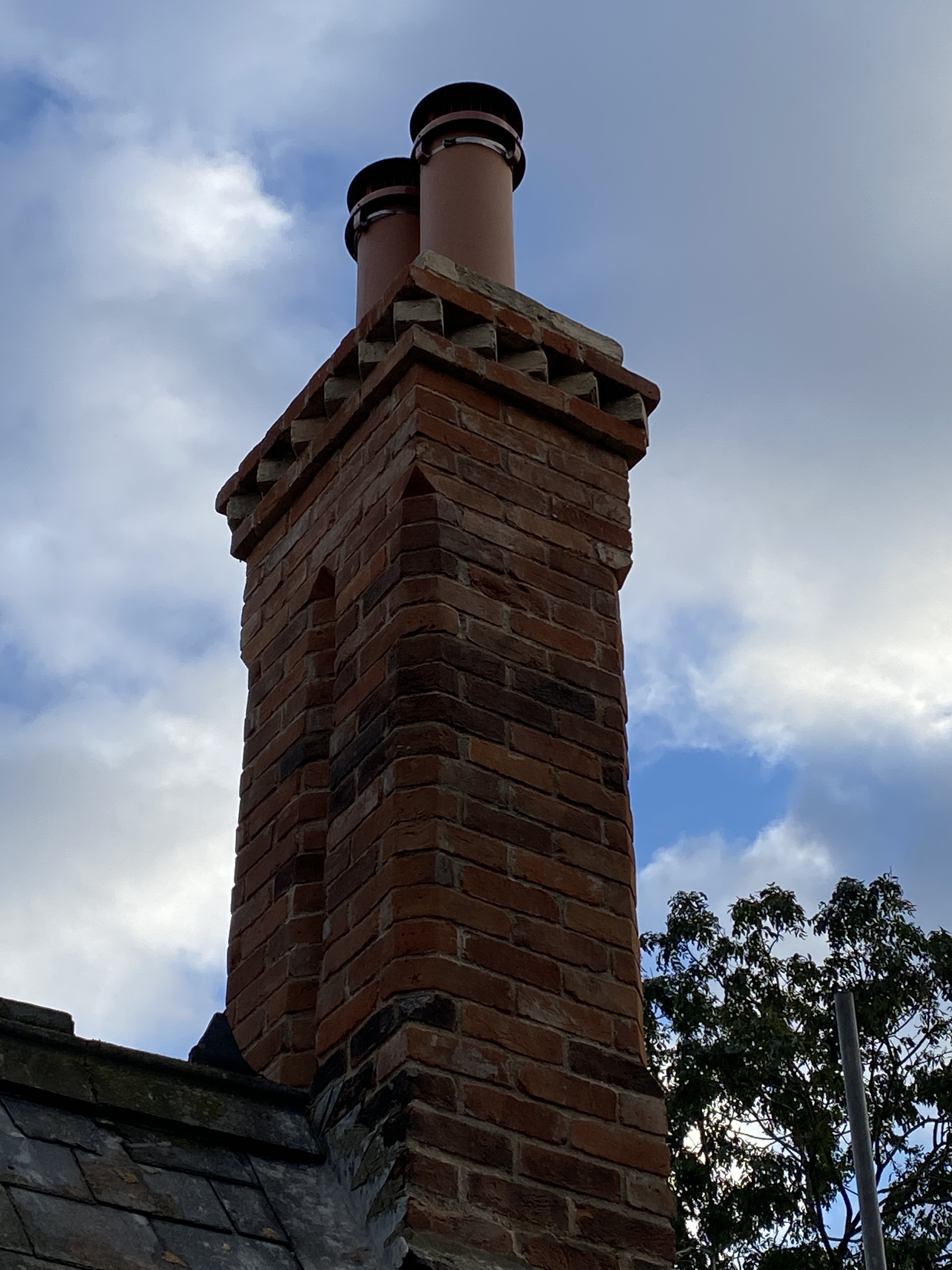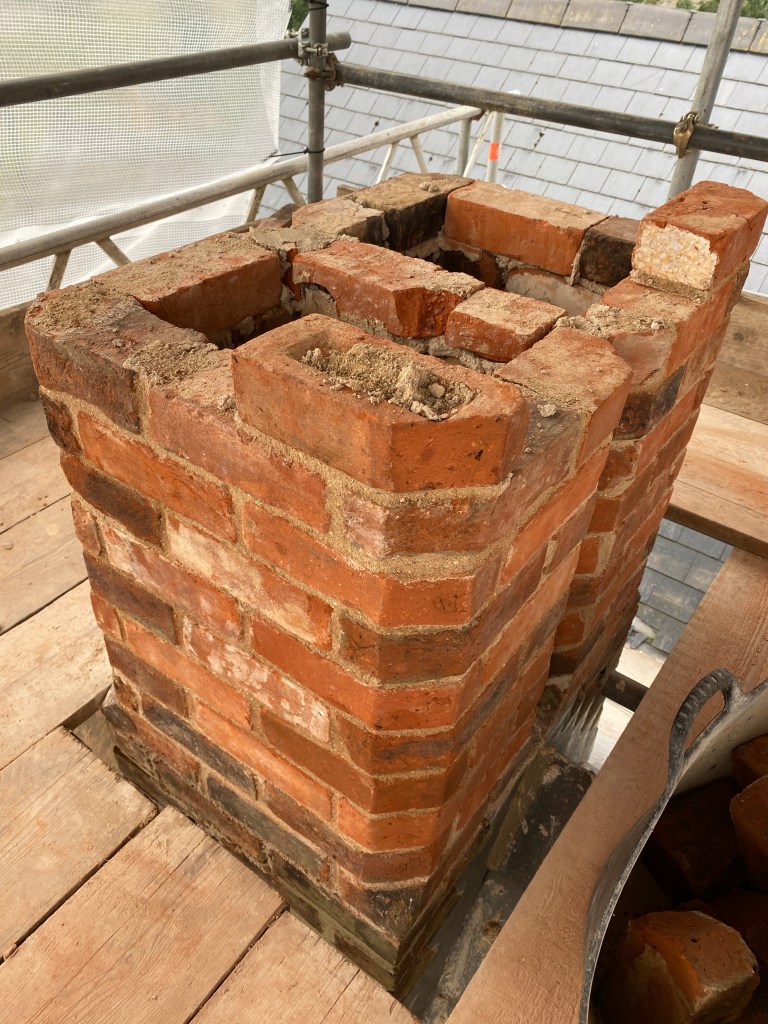 The chimneys were showing signs of fatigue. In the 1960s some of the chimney pots had been removed and chimney liners put in their place. The chimney stacks had also been repointed in cement rather than lime. All chimneys have now been taken down to roof level and rebuilt using reclaimed bricks in the original style including a colour matched lime.