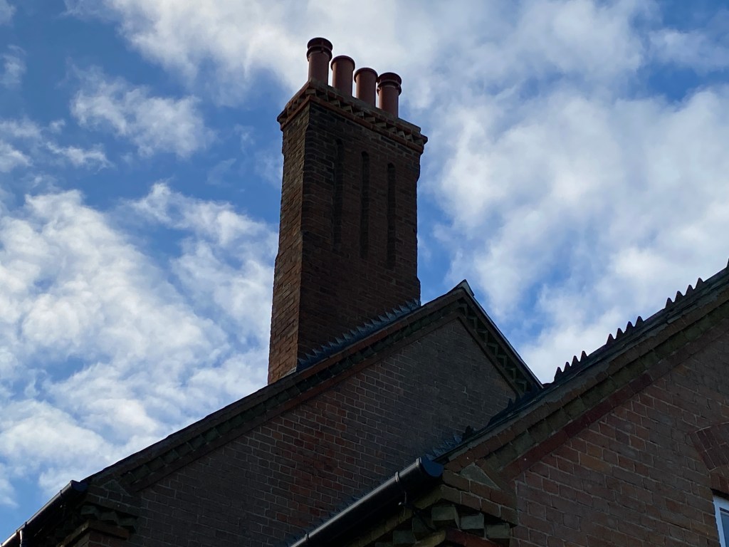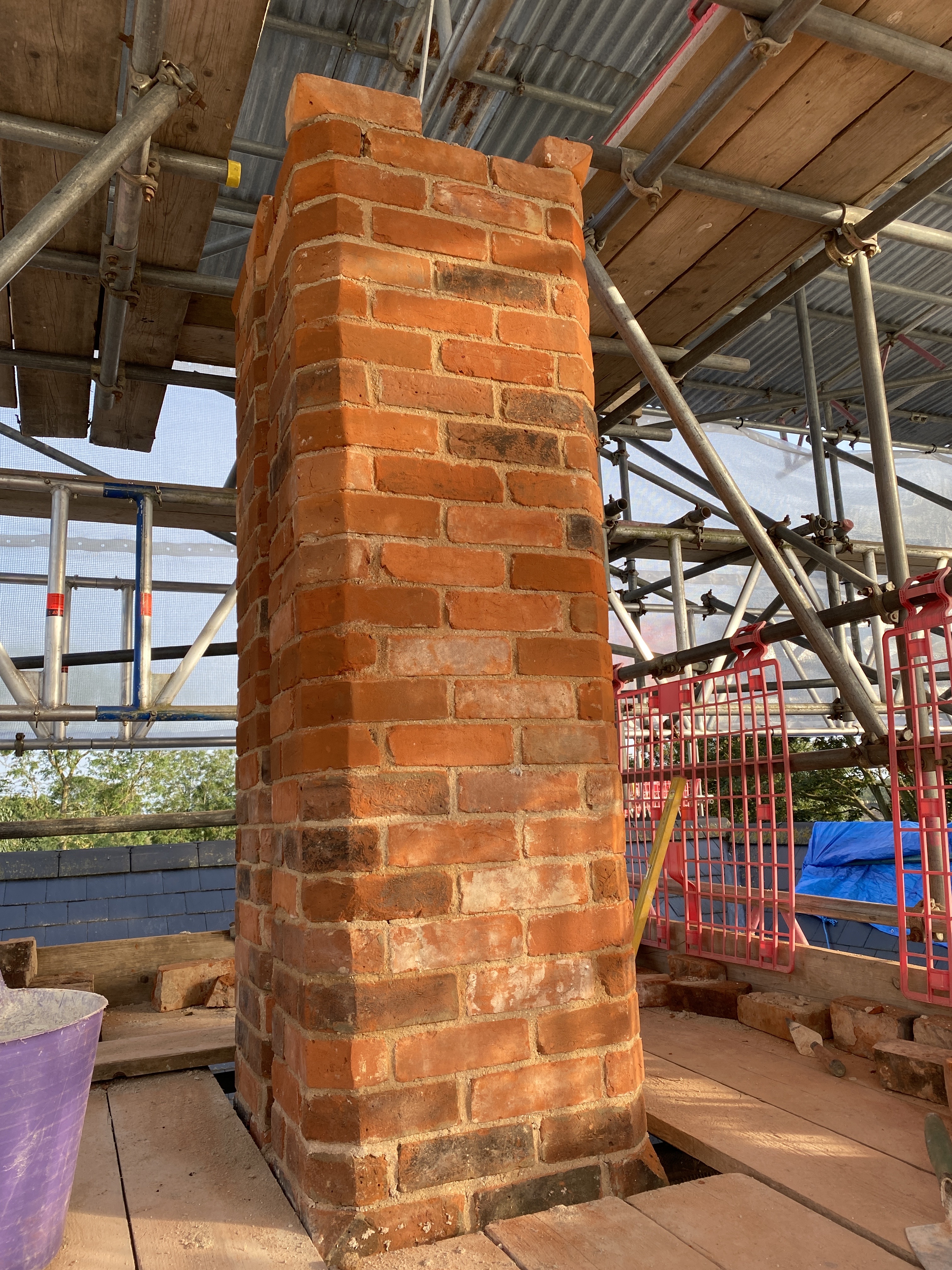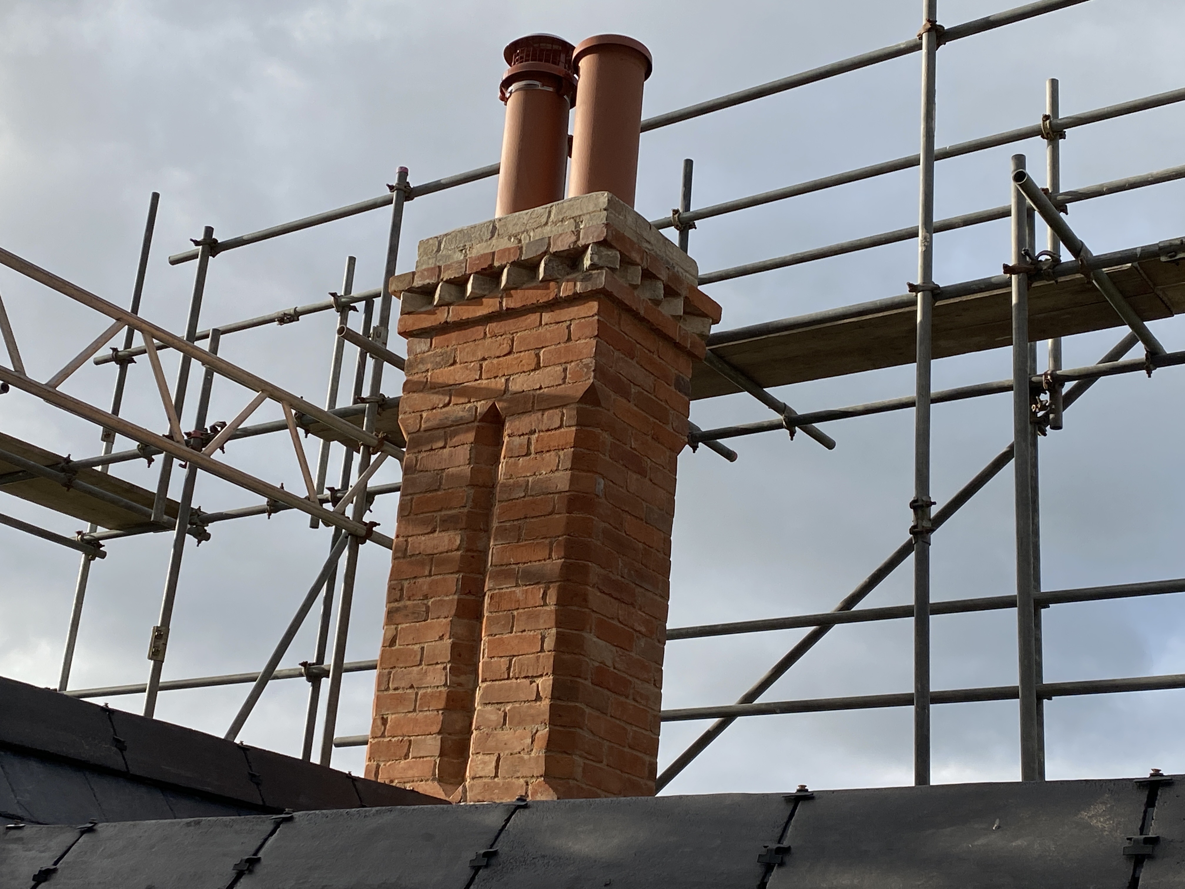 The chimneys were showing signs of fatigue. In the 1960s some of the chimney pots had been removed and chimney liners put in their place. The chimney stacks had also been repointed in cement rather than lime. All chimneys have now been taken down to roof level and rebuilt using reclaimed bricks in the original style including a colour matched lime.