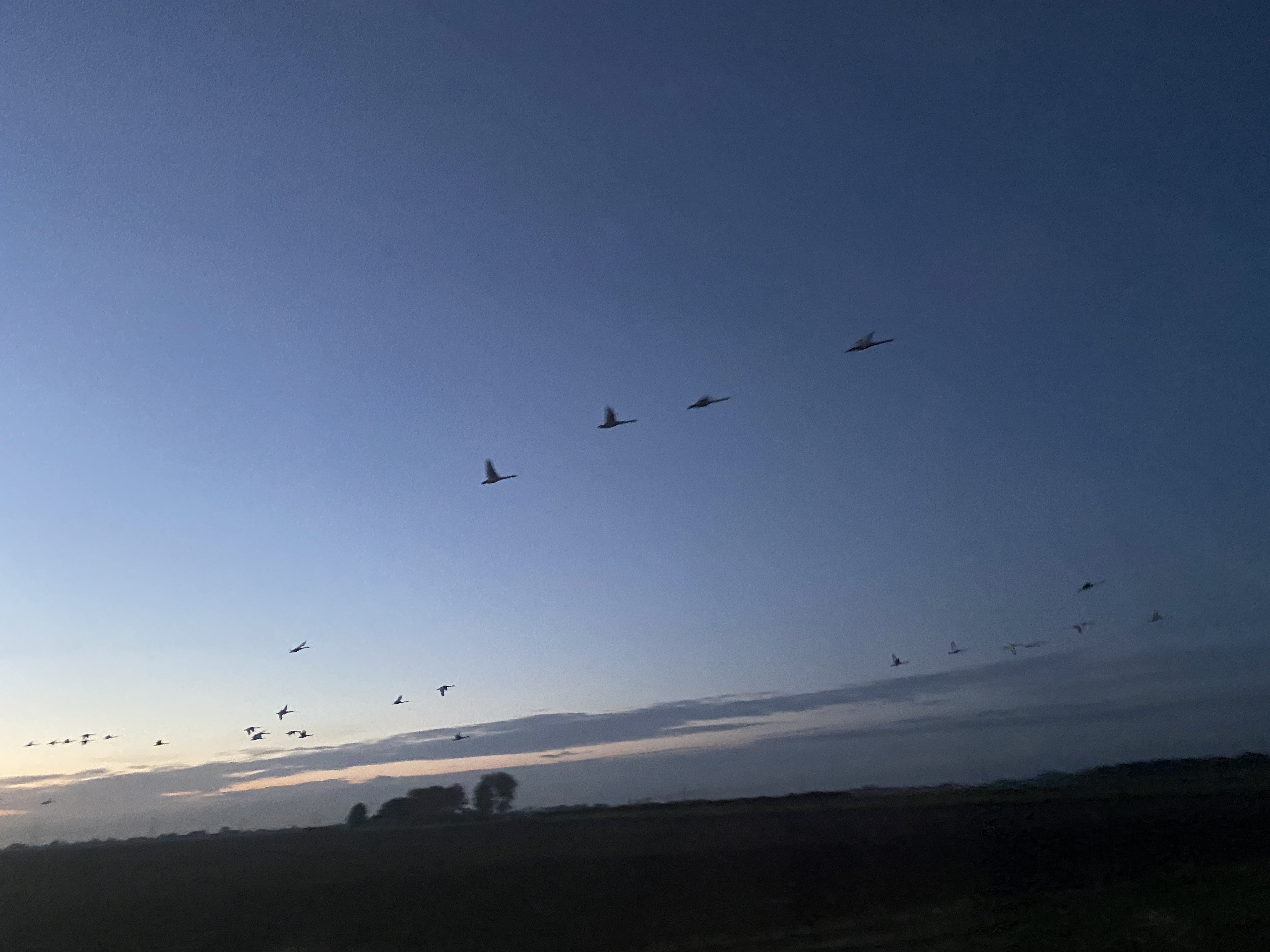 The fields around the Old Vicarage are sometimes covered with hundreds of migrating swans. These were flying alongside the car as I was driving down into Little Ouse the other night. Although they can’t be seen in the twilight, there are scores of swans in the fields, either resting or getting ready to move on.