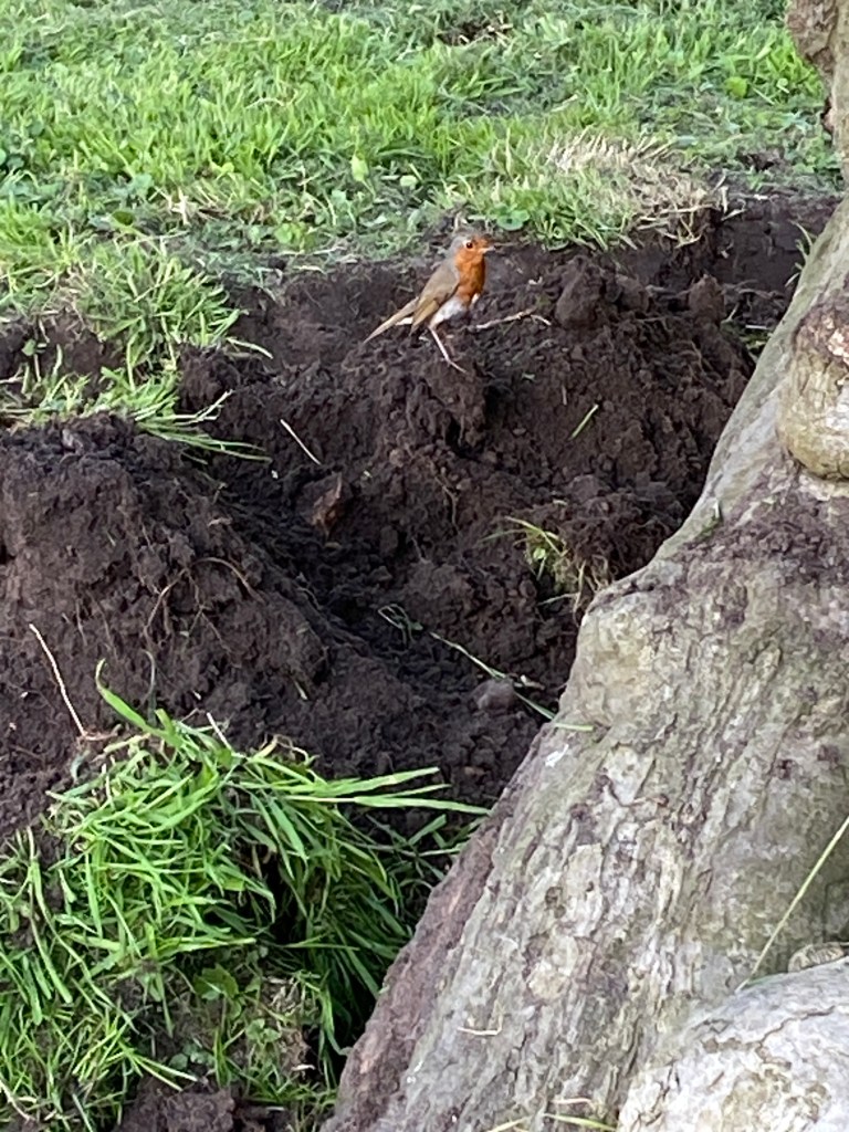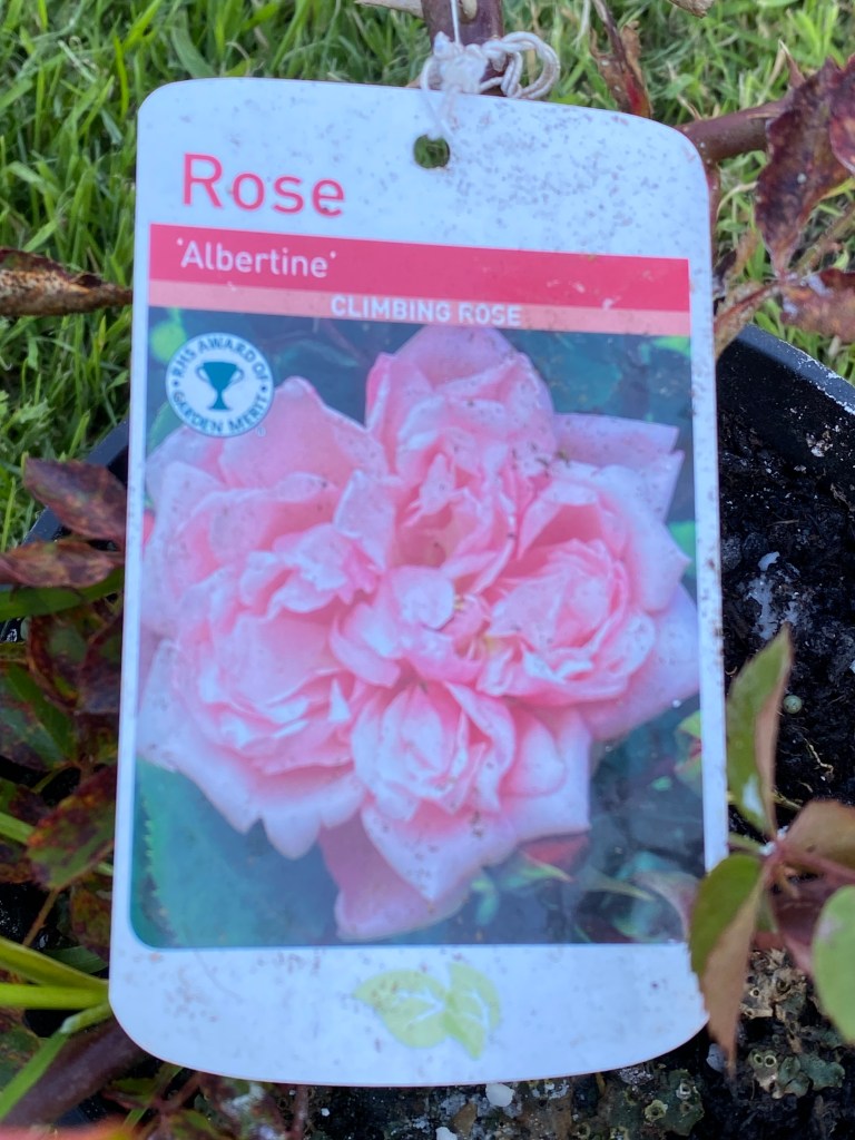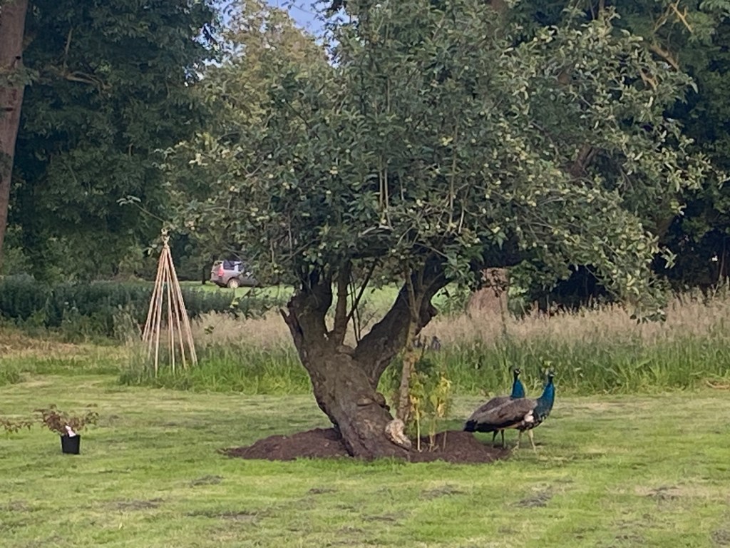As the trunk of the apple tree is at a sloping angle an Albertine climbing rose has been positioned on one side, to grow up and through the canopy. At the back of the sloping bough, if you look carefully, you’ll see a bamboo cane. A clematis has been planted here and it is hoped that this will also grow through the canopy. With luck, after the apple blossom there will with be at points a flowering of clematis or roses or both.
