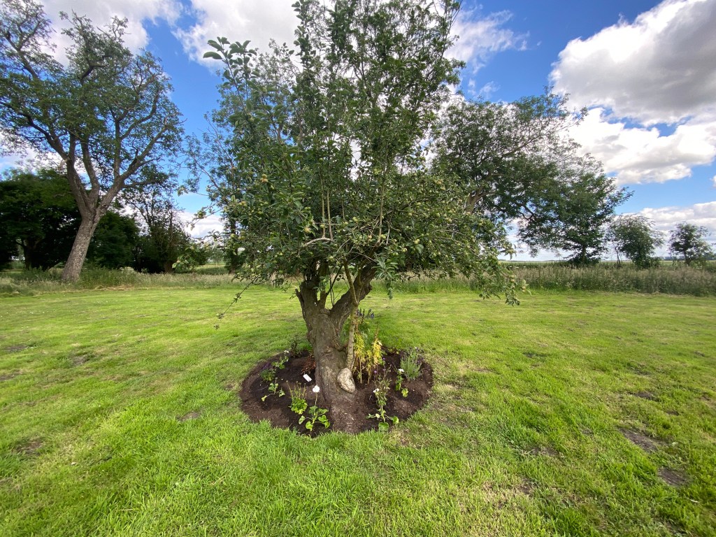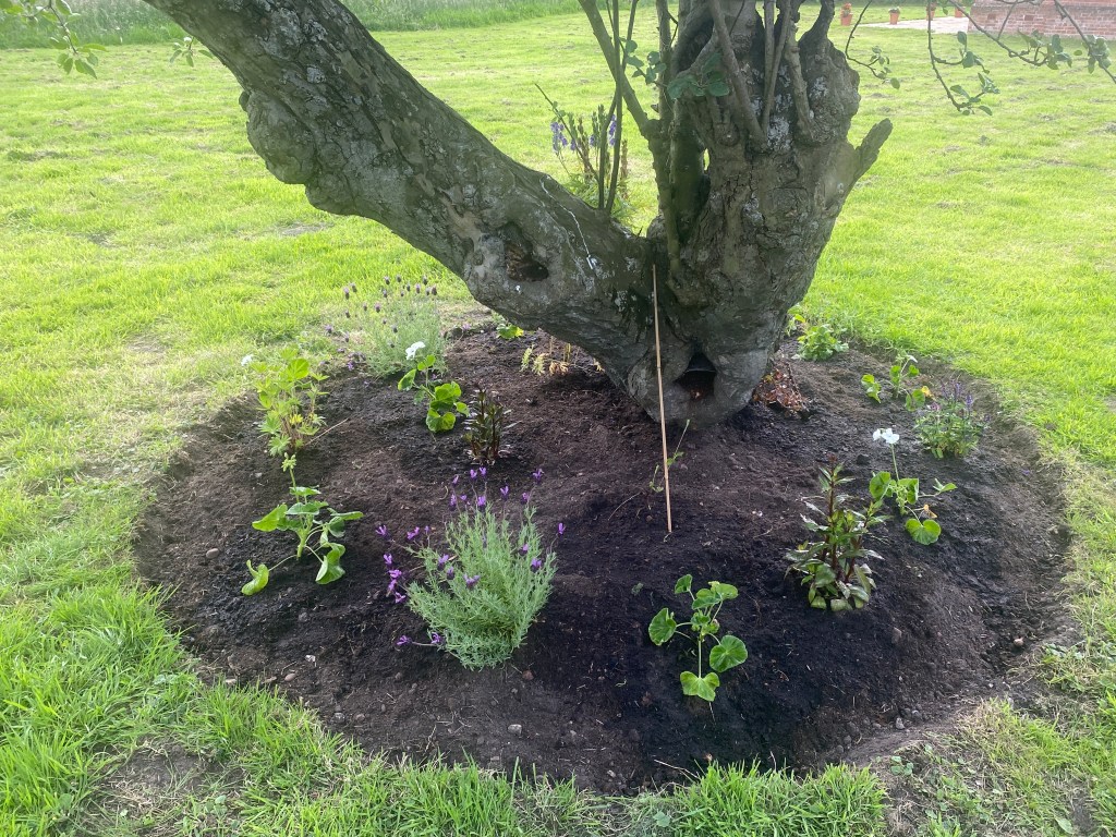 This old apple tree is well past its prime and as we are not looking for it to produce apples (though it does produce a very small sweet apples). The choice was to either leave in the middle of a lawned area, or use it as a feature and plant around it.