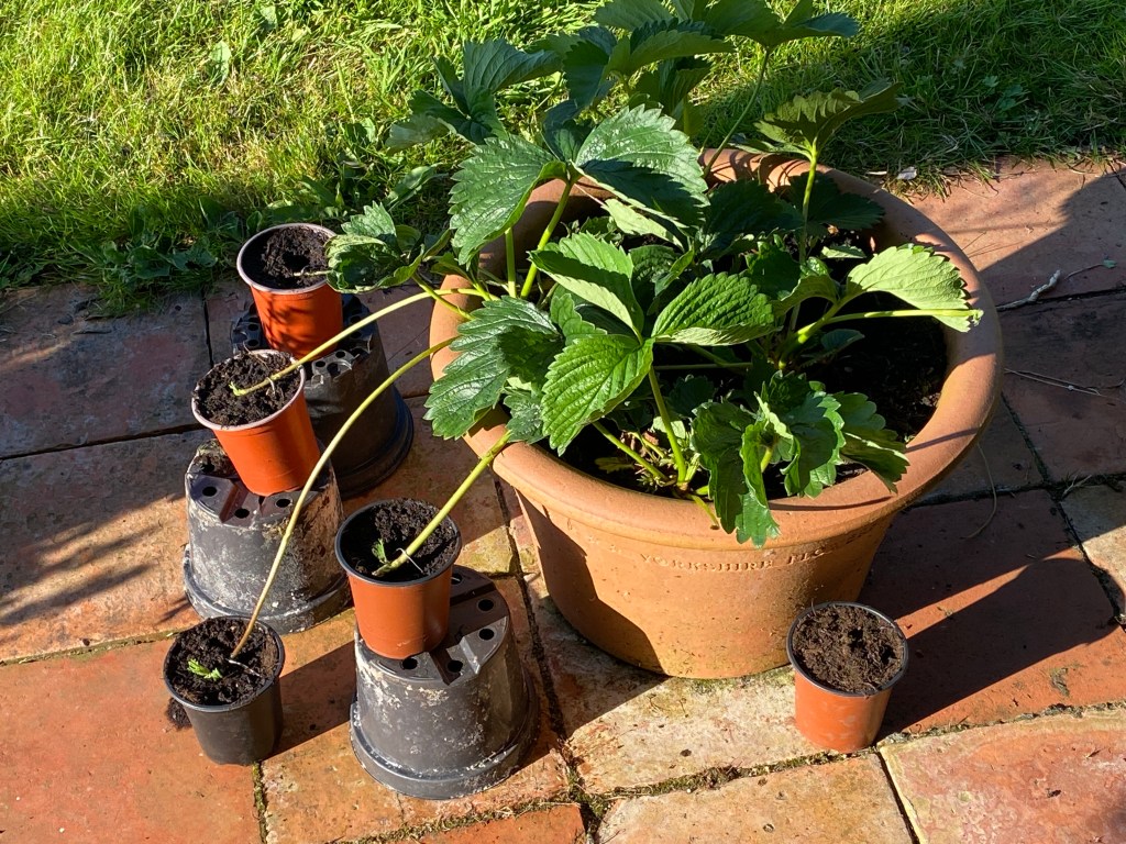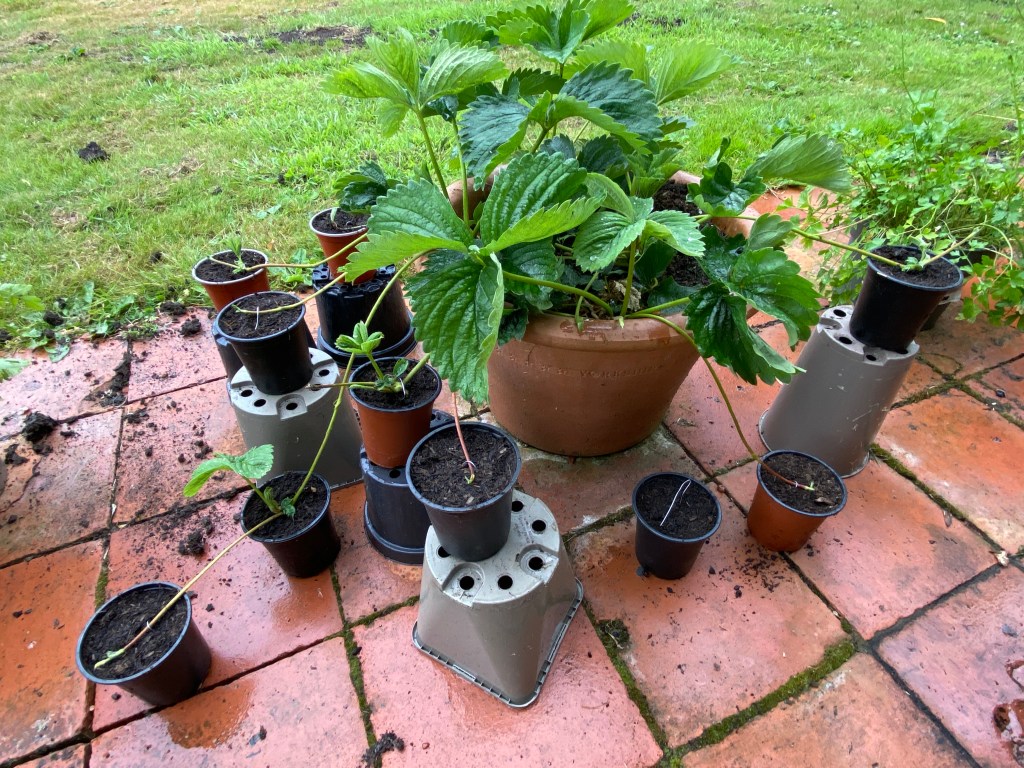 Time to start pinning down a few of the strawberry runners. If they multiply, as previous times, then the three host plants and their offspring in the next couple of years should make a good bed.