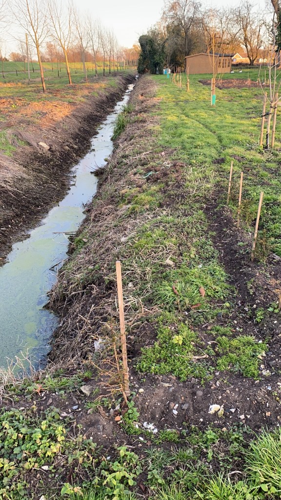 There are already mature trees, mountain ash, walnut and oak that in places already shade areas of the bank at parts of the day. There are also new additions, such as a couple of weeping willow and some beech trees that will in years to come, will restrict light or hang over the water feature (ditch).