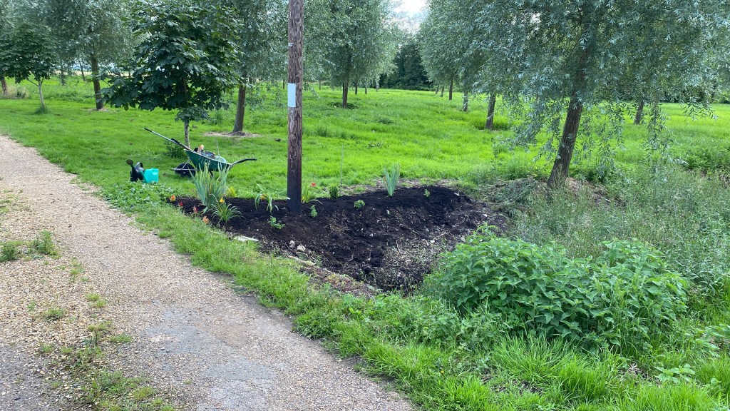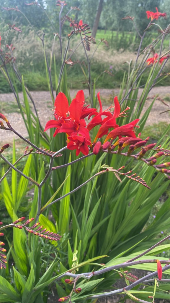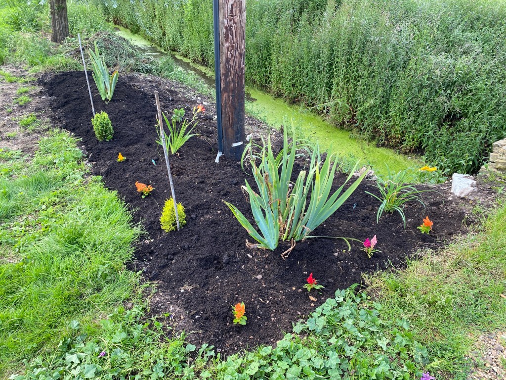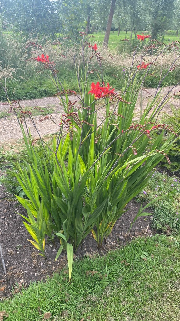The ditch length is in excess of three hundred metres long and at least two metres wide from the water to the top of the border. Quite a large area to plant and manage, So to minimise the cost I’ll plant up sections over the coming years by dividing corms to create new areas perhaps with some new additions. I would hope that in several years the entire flower border by the ditch will be a mass of irises, day lilies (hemerocallis) red hot pokers (kniphopia), Crocosmia and plants generally with those sword like/pleated leaves. leading down to the waters edge. I’m sure that at some point I will plant some candelabra primulas as well on that bank.
