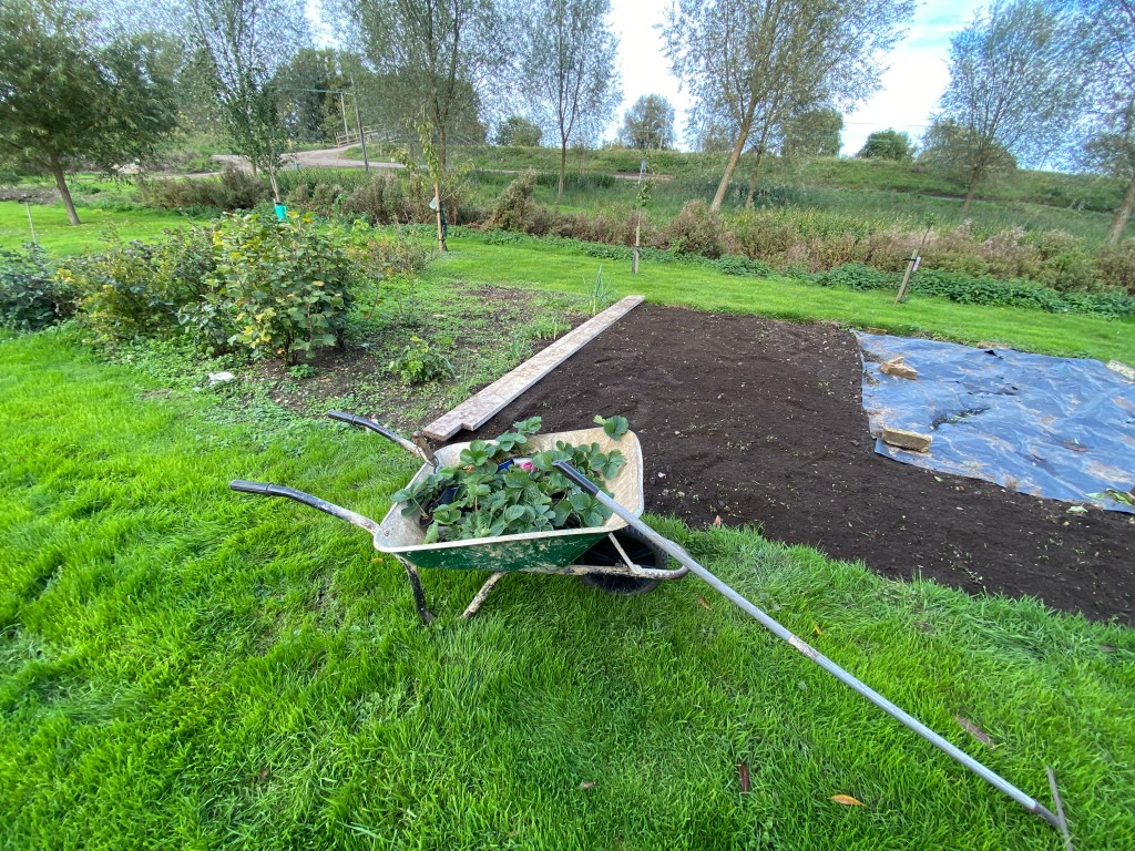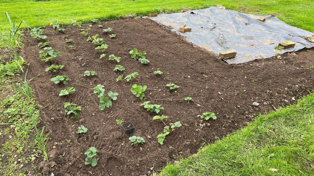 I seem to have got to most jobs at least a month after planned this year. The vegtable/fruit plot is no exception. From three strawberry plants of the variety Elsanta bought from Wilko a couple of years ago for £2.50. There are now about forty runners that I potted up during the growing season and planted out in October.