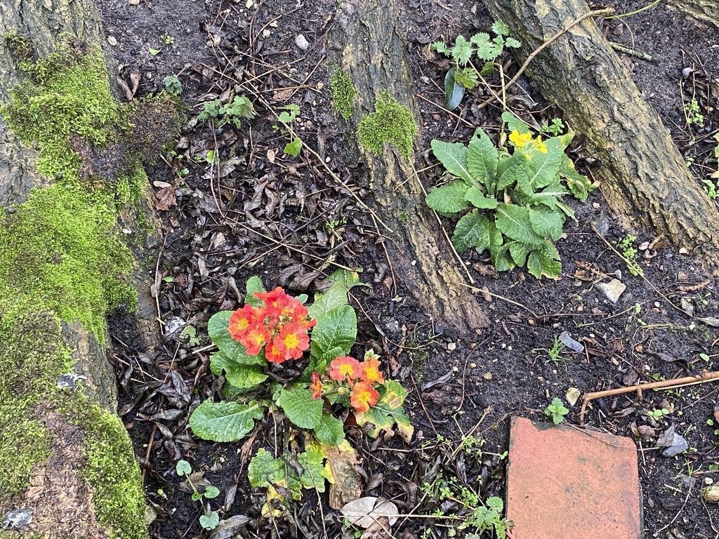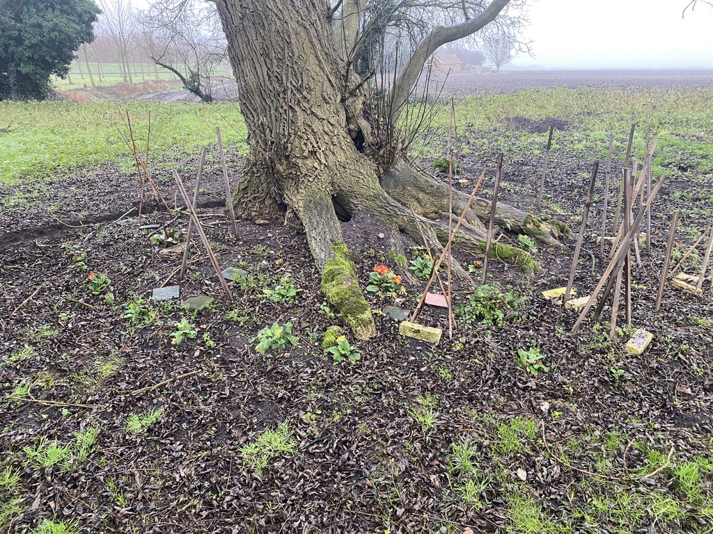 Winter Aconites and Primroses around the old Mountain Ash