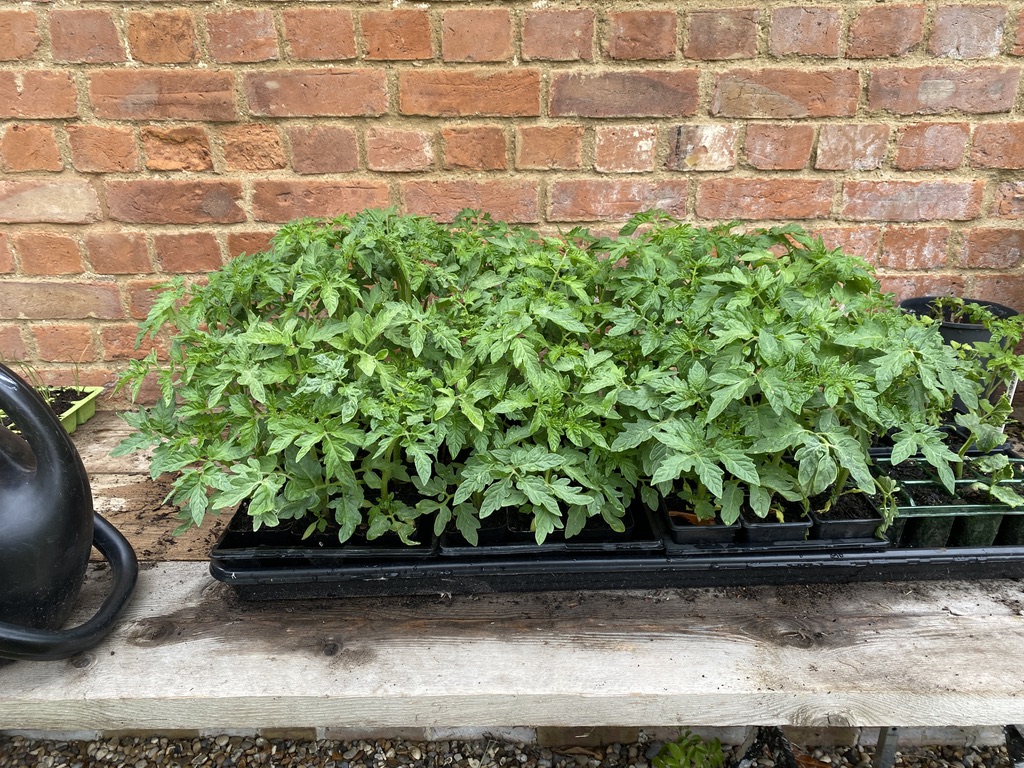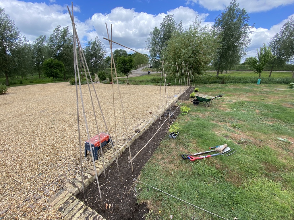 To the left you can see the back of the main house, wher ethe Old Kitchen Garden would have been. It has now moved into probably the area where the horse paddock was at the back and side of the Old Stable Block. You can see the Vegatable/fruit patch, which will increase in size over the next few years.The new border to the right of the Old Stable. This is where the hedge will be planted later in the year. The border will probably double to triple in width to allow further planting of flowers and bushes to compliment it.There are several openings. This will allow the gardens beyond to be seen. The Summerhouse will have its own garden and borders planted.All the tomatoes were started off in March in a cold outside room in the stable and then stood outside in May once the frost had passed.Three scaffold boards and a couple of builders trestles makes a good working area outside for potting up. The tomatoes are Alicante and also a cherry variety. On the Left of the Old Stable block I dug out the grass at the edge of the car park which was always awkward to keep trimmed.,This is now full of runner beans and sweet peas. I always like to break any hedging with gaps/walkways. You should always be intrigued and want to explore the next room/area of a garden.All started in a cold room outside and left outside to harden off.For cost effectiveness, I have chosen to use twine for the majority of the runner beans to climb up. Otherwise, I would have had to spend a small fortune on canes, hazel supports or netting. You can see my plumb line at the bottom of the picture. It’s embarrassing to not have a nice clean edge on the border.