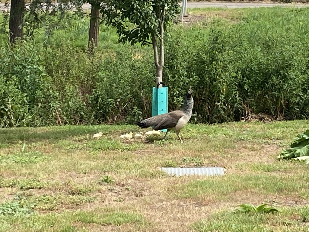 The peahen nested in the garden of the Old Church and is now takes her new family on a daily walk around the gardens of The Old Vicarage. I have left most of the red fruit uncovered this year, which they have taken great delight in. They especially liked the strawberries, raspberries and loganberries.