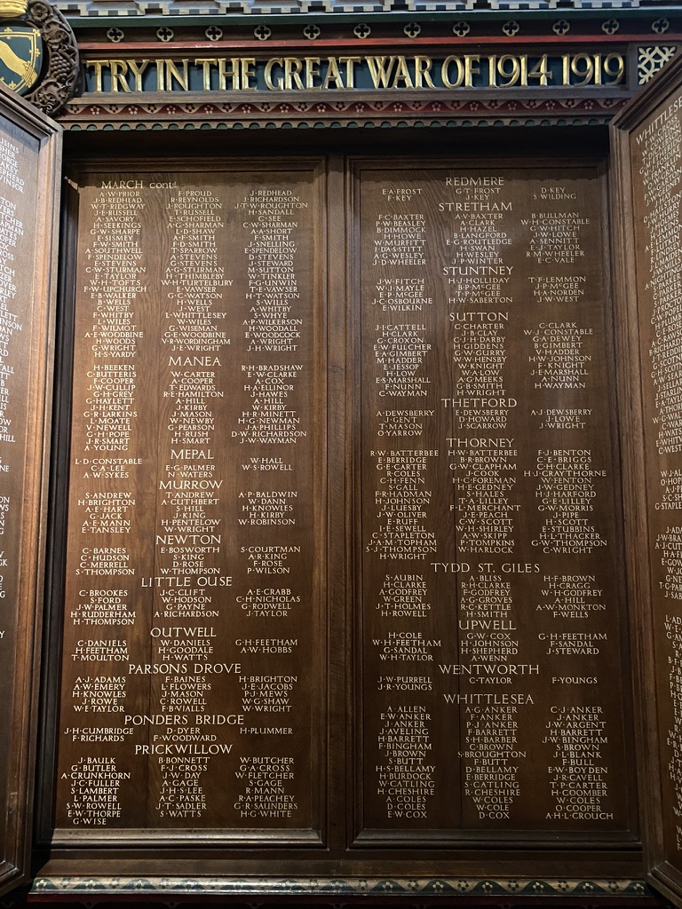 When the church (St John the Evangelist) in Little Ouse was decommissioned in the 1970s, its brass plaque commemorating the fallen was moved to St George’s Littleport. In Ely cathedral there is also a memorial for all of the towns and villages covered by the cathedral. One of the areas show in the chapel is Little Ouse.