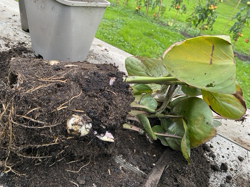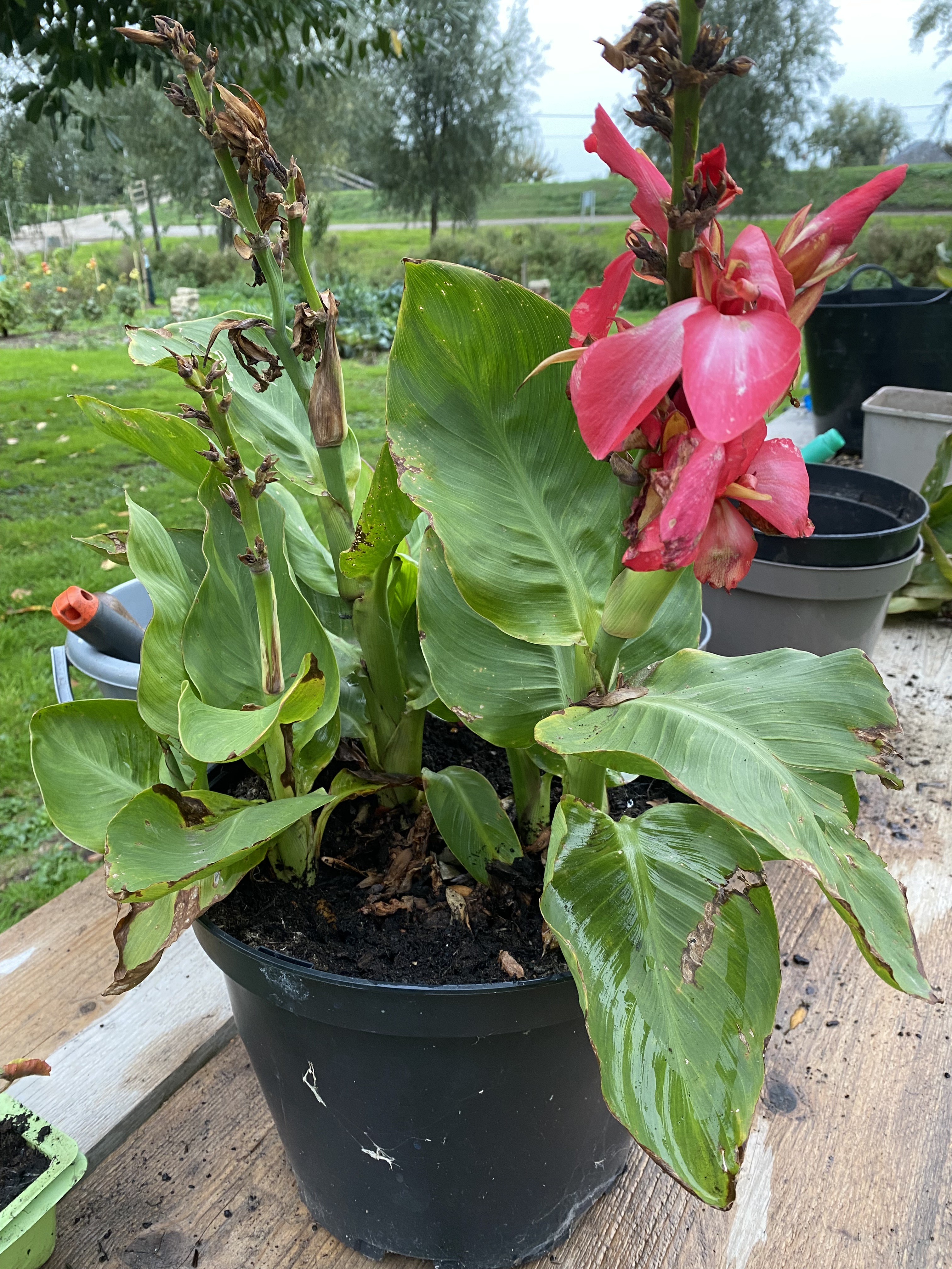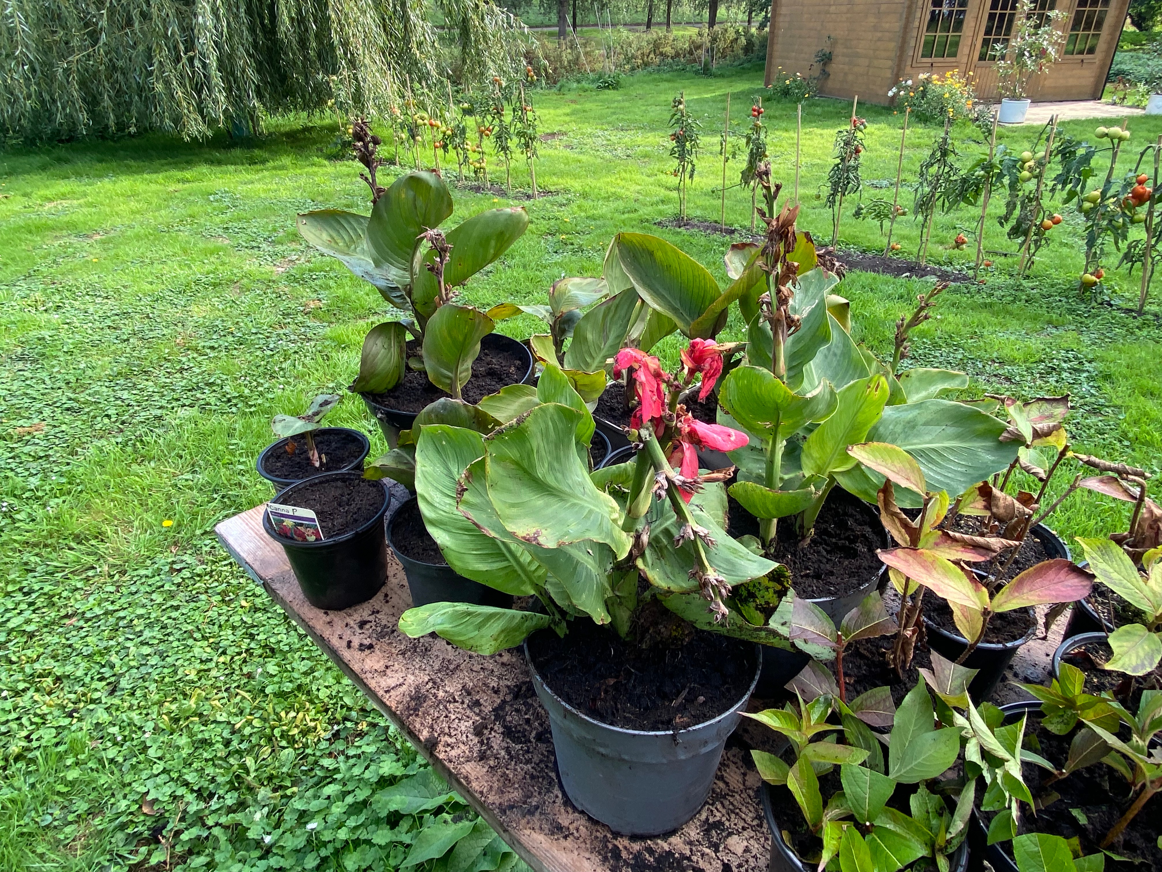 Keeping over winter. I don’t bother with all the usual practise of lifting and drying like a dahlia or leaving in the pots and chopping back the foliage. I don’t bother cutting back, I just simply put a couple of trestles in the old stable block that has a good sized window and seldom goes below 10c and leave the pots in there to go dormant. I remove any leaves that die to avoid rot and remove any mould that forms on the surface of the compost, by just breaking the surface (the airflow is usually good enough to prevent this, but when I pack lots of plants in the old stable block, sometimes you do get a bit) water sparingly, maybe two or three times during the November through March period and start to water more when new shoots appear in the spring and start to feed with a general purpose feed, moving to a tomato feed when they start to put up the flower spikes. I don’t worry too much about seaweed feeds etc. I just get the most economical for the flower beds. Whatever is on offer usually. I keep the good stuff (organic) for the vegetable plot.