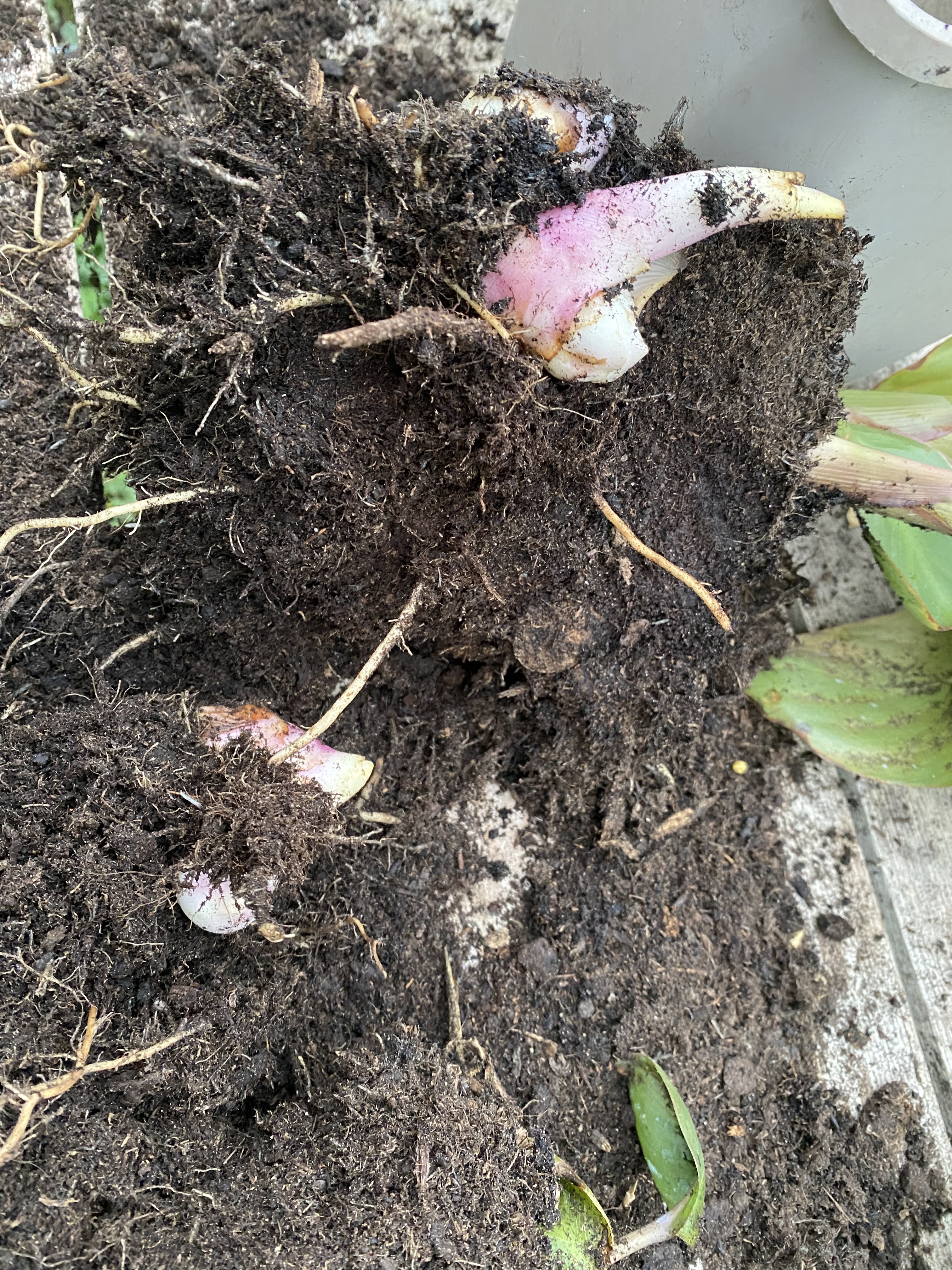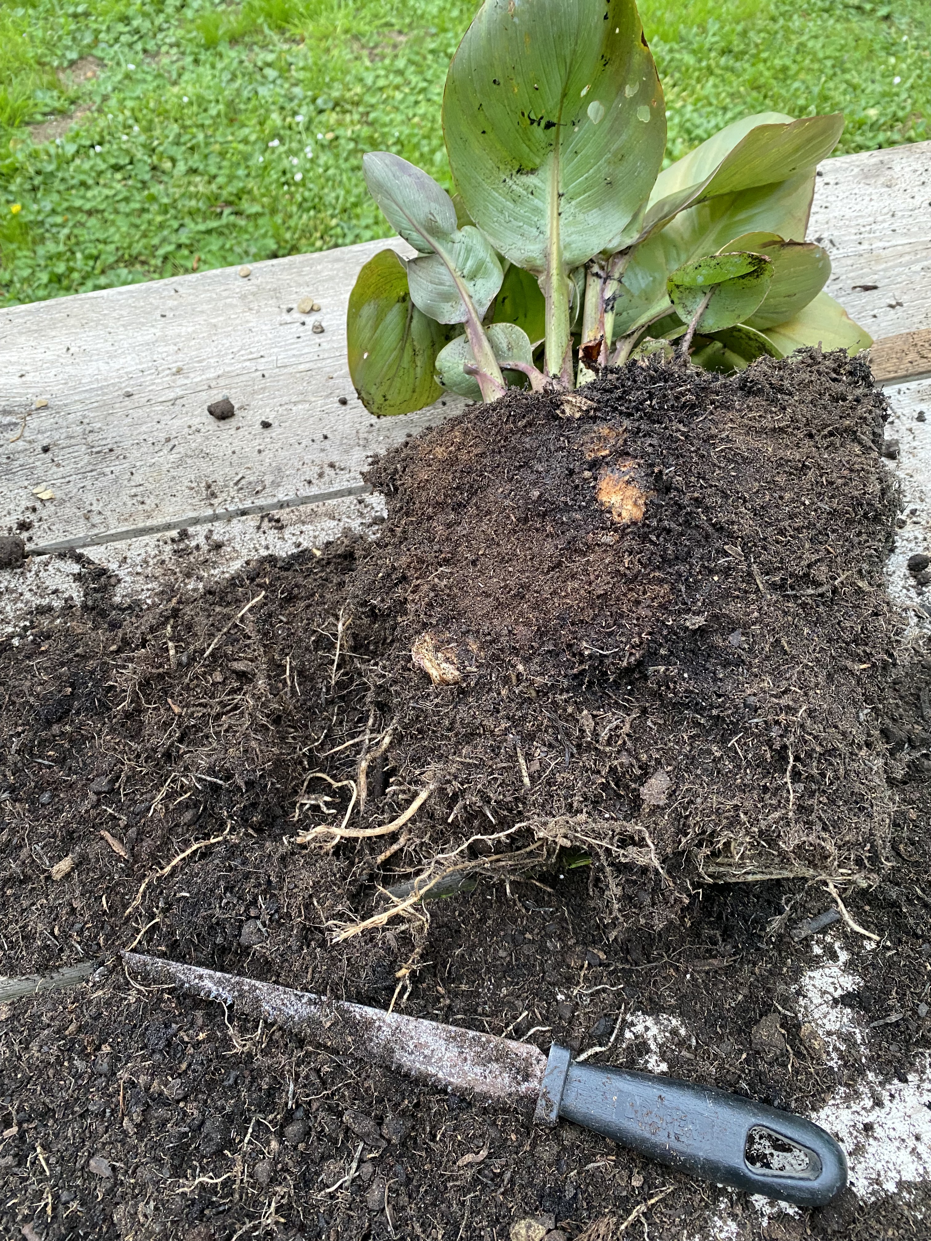 I bought four of pots of canna lilies about two years ago and place two in the garden and left two in pots on the stable courtyard. The local wildlife enjoyed the ones in the ground and they never managed to establish, even though they made it through the mild winter with a good mulch on them. The ones left in the pots have quadrupled in size and have needed to be potted on twice. Although they are not looking too dead in the centre, they are again starting to stretch the sides of the pots, again! Rather than pot into a larger pot, I have decided to split them, making sure there are some growing points in each pot. They split quite easily, I use an old plasterboard saw to get started and then just prise them apart. I don’t worry too much about making mixes of compost with perlite for drainage. I just use a peat-free compost. If I want drainage I just use fine gravel from the carpark (griddled and washed), a much cheaper option.