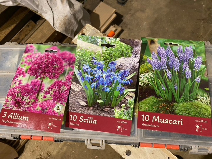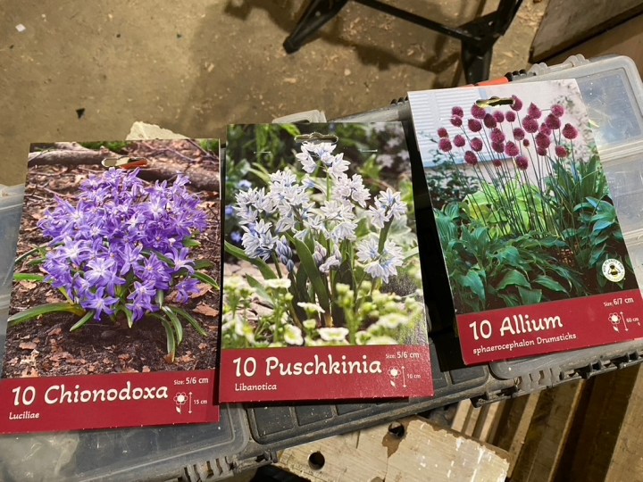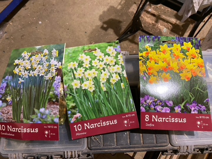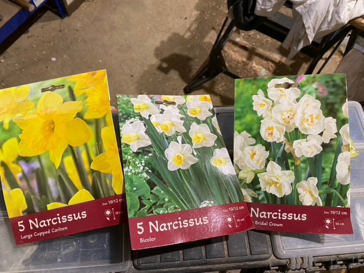 I stopped at Sharman’s Garden Centre in Littleport on Sunday and as expected they had a nice display of spring bulbs. I normally drop in every month or so to see what looks good. This year, I have decided to start the long process of populating The Old Vicarage lawns with spring bulbs. This year my focus is mainly on daffodils/narcissus, but quite a few other crept into my basket! Next year, I will focus on cyclamen and snowdrops. The lawn near the summerhouse and by the old ash trees already has a large naturalised colony of golden winter aconites (there is a previous posting showing them). I think I may be tempted to start adding crocus and snowdrops in that area.