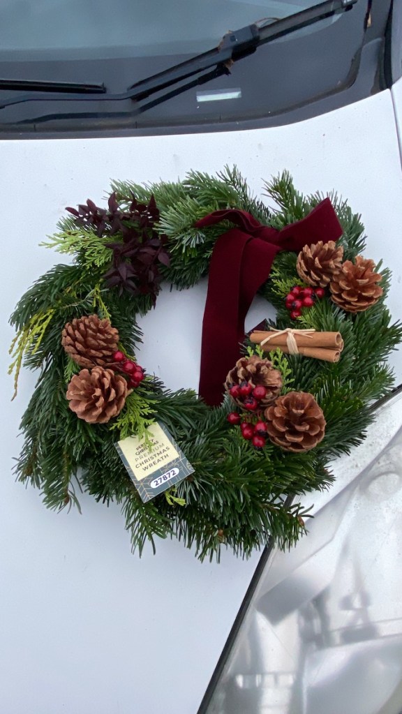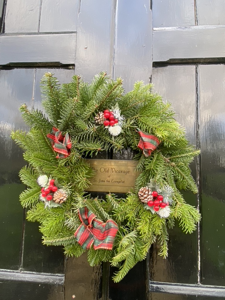 I saw this one at Aldi, and as it is going under the porch at the side of the house, i thought the velvet bow would last very well. This one was around the £11 or £12 pounds mark.