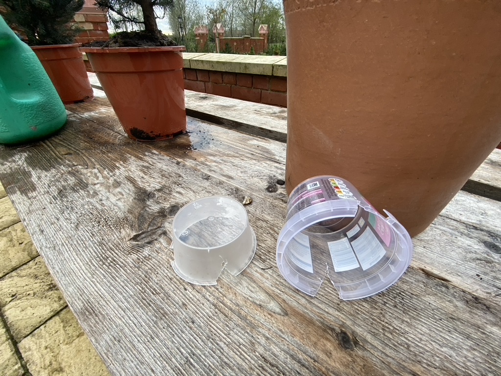 I don’t have any crocks for the bottom of the pots, so I usually make do with a small plastic tub and cut a few drain holes in them.