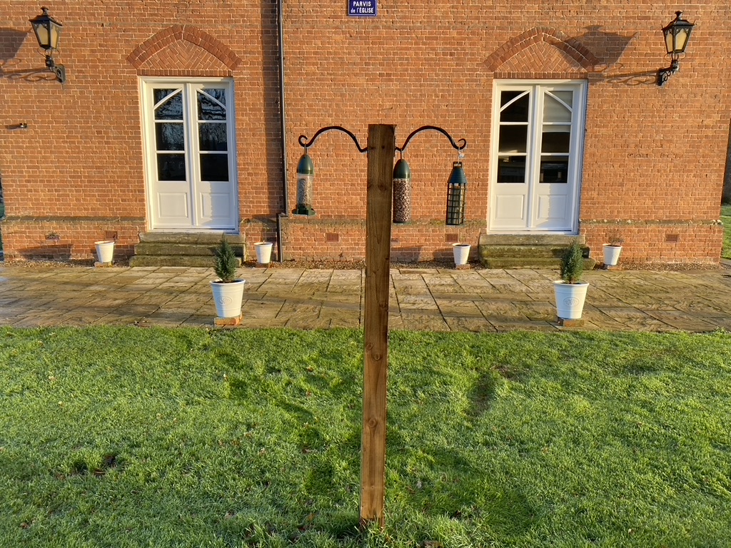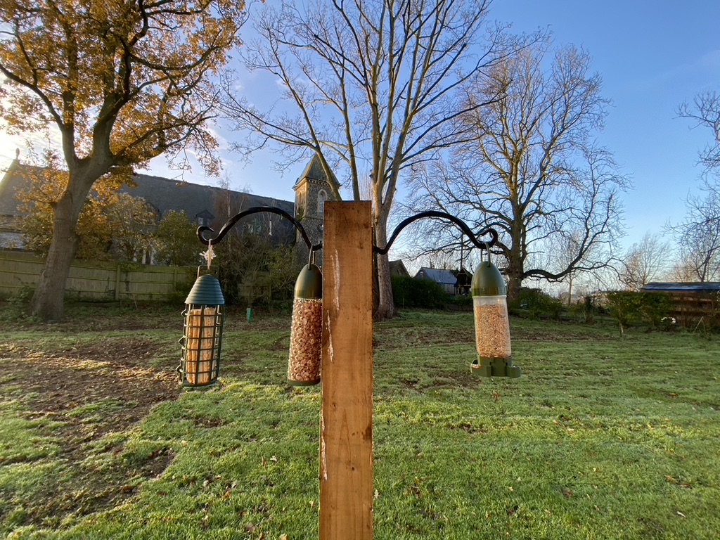 I have a metpost in the lawn facing the church where I place a signpost when hosting summer parties. Having found a spare fence post in the shed, I thought this would be a far superior place to place the feeders here this year. It is in the middle of the grass area, so any predators can be seen approaching. It is also close enough to the main living room windows to be able to keep an eye on them feeding and see how much feed is available.