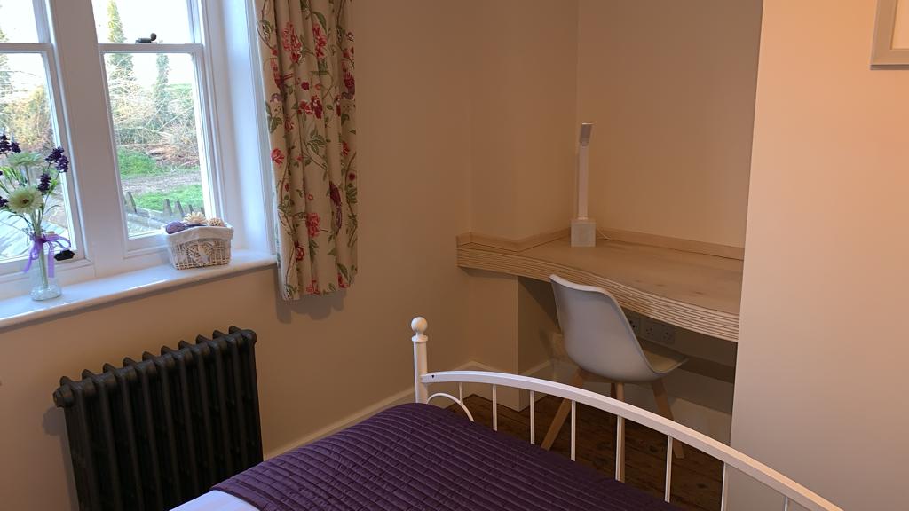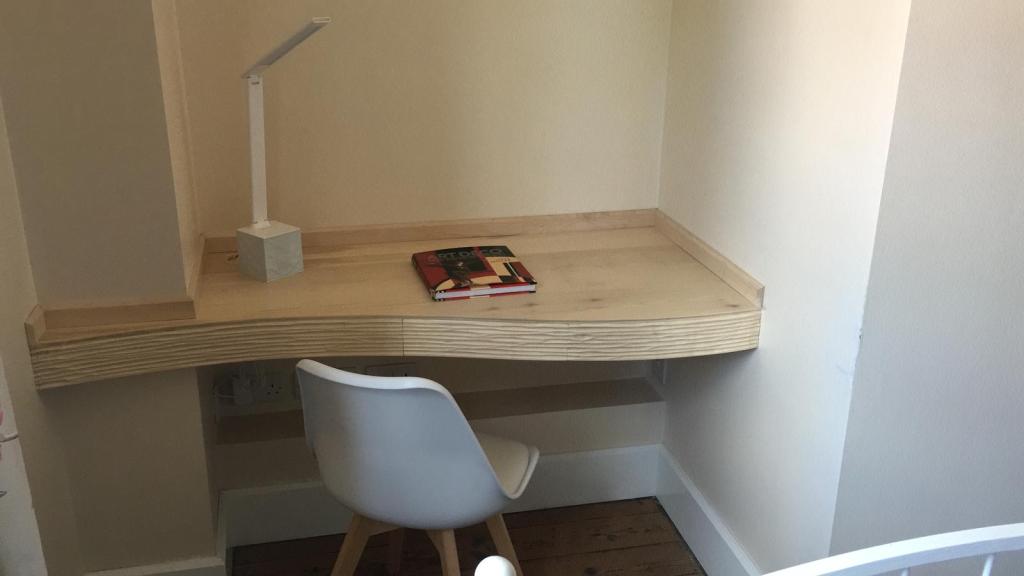 The corner by the window now has a purpose built desk in sycamore