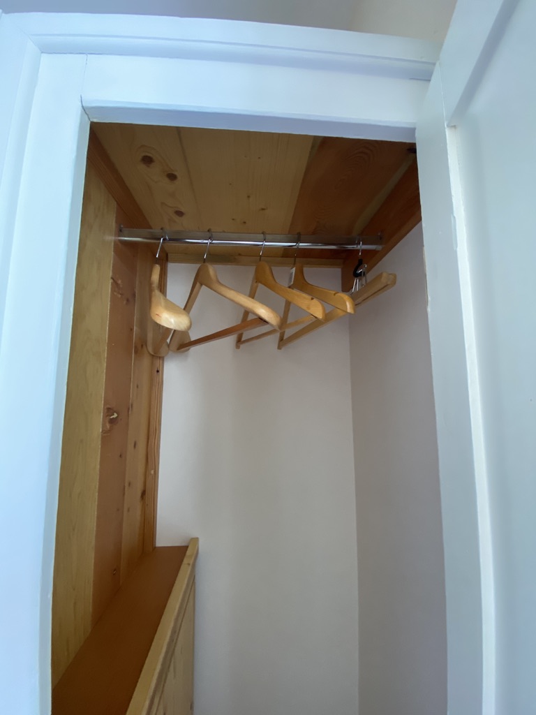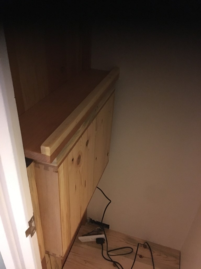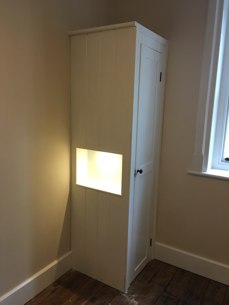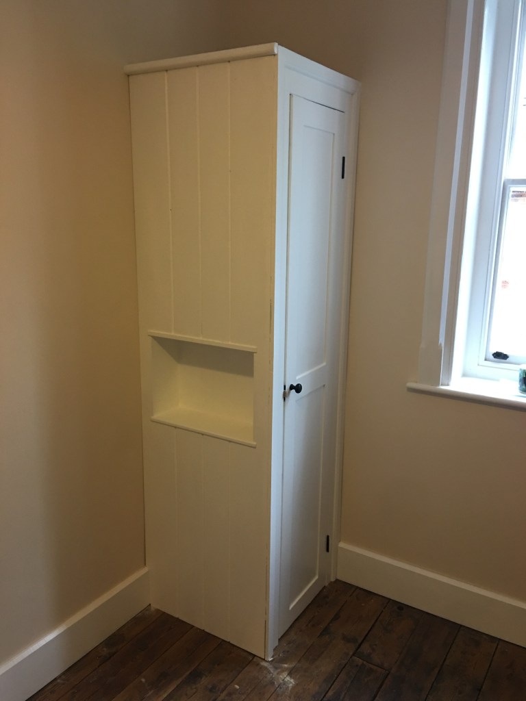 The previous occupants had removed the door from the plank wardrobe and placed an immersion heater in the cupboard. It didn’t exactly fit and was half in and half out. Which is why they probable removed the door. This was removed to make way for an ensuoite in this area.