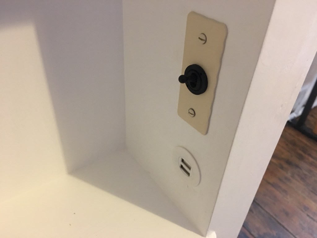 - Wardrobe – The new fitted wardrobe by the bed reuses the door and frame from the cupboard in the master bathroom and is an excellent reuse of available materials. The plank sides mimic the original simple design of the original wardrobe in this room are reclaimed pine. It is worth noting that the original wardrobes did not have the depth to accommodate a modern coat hanger, they had two wooden hooks. I expect this near enough sums up the old saying “One on and one in the wash”. The new wardrobe while respecting the original design gives this increased depth. One last design feature of this wardrobe is the box insert on the side, which acts as a bedside shelf. This has a ligh as well as USB sockets installed.