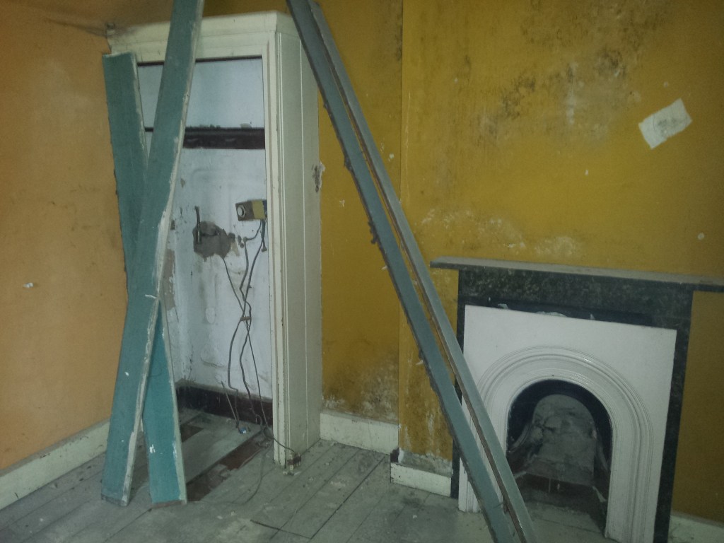 This fireplace insert was found in the outbuildings and was cleaned up. It may have been the one for this room as it is the same design as those original ones in the other rooms. It of course shorter than the surround, but this could be one of two reasons. 1) It was removed and cut to be used in the outbuilding. 2) It was always like this. In some of the other rooms, they also don’t fit and were nailed in position and then a lime cement used to set them in which was then coloured, so you don’t notice they don’t quite fit. We have set this in now and used some tiles at the top which match the colour of the surround, see later pictures.