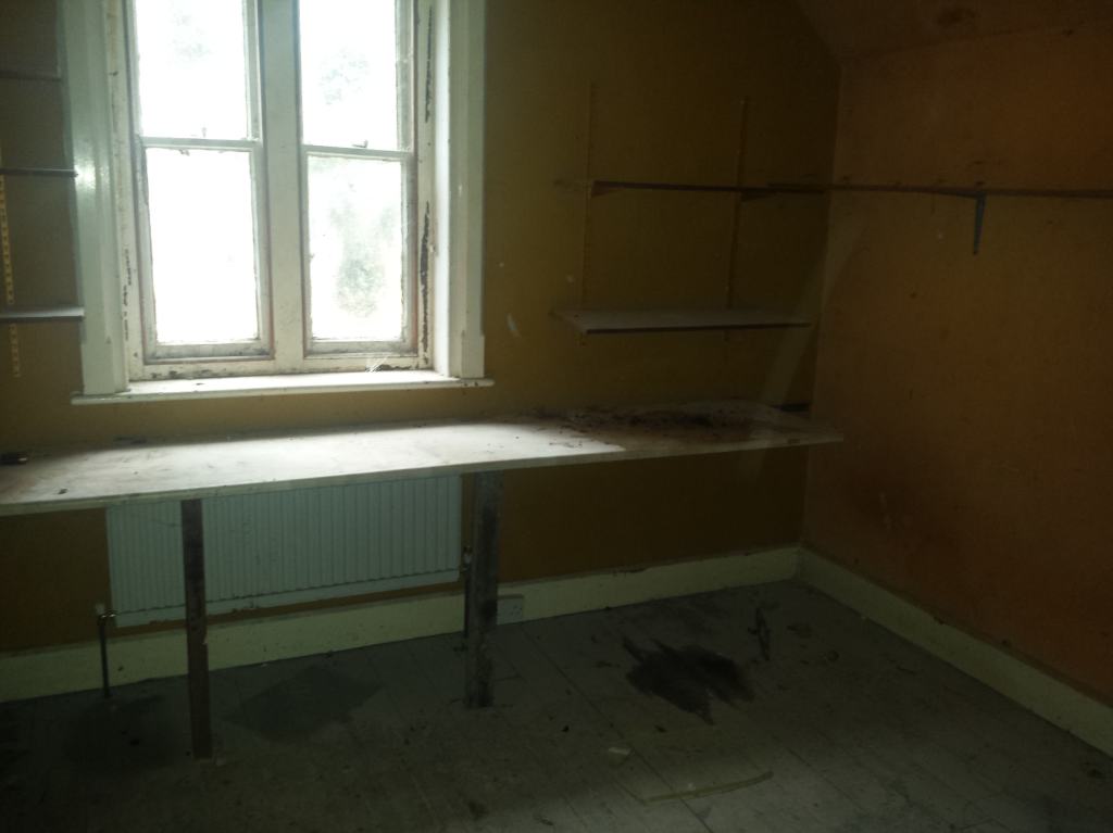 This room seemed to have been used as a workshop by the last occupants. All of this shelving was removed and the spillages on the floor cleaned up.