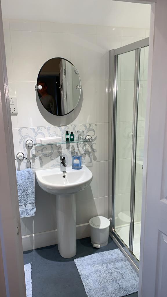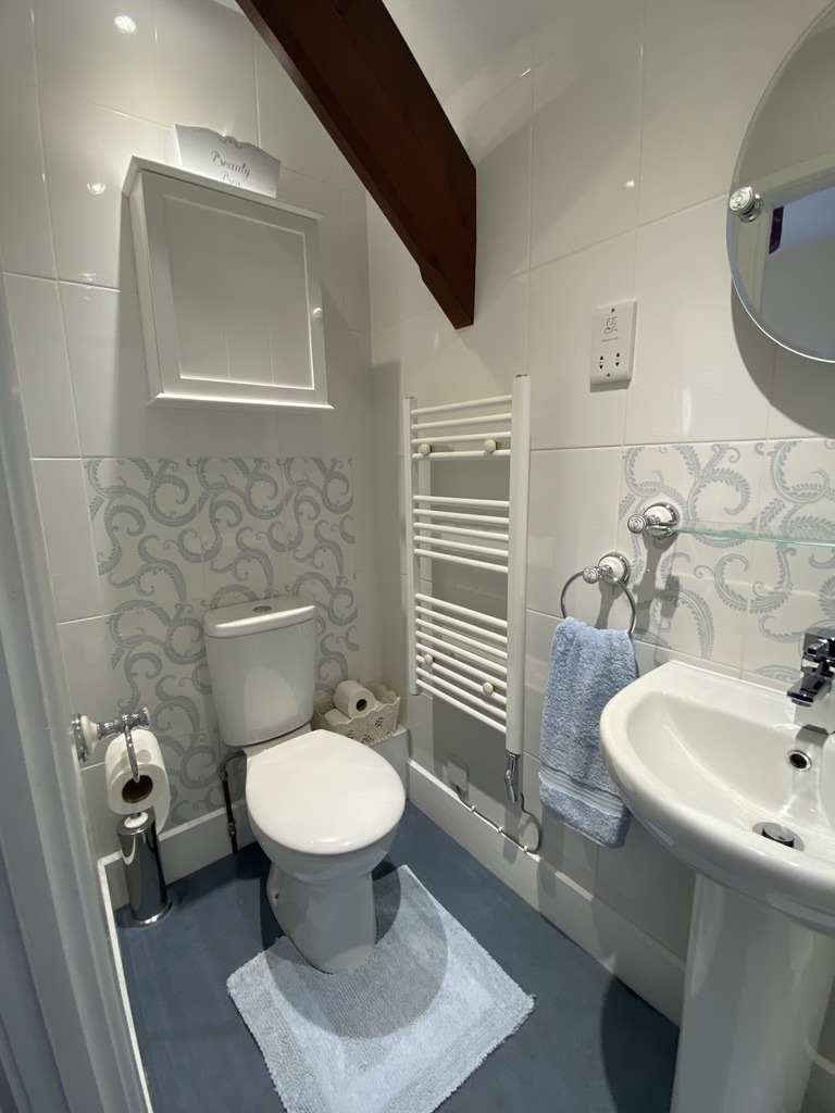 - Ensuite – A new ensuite was built in the room where the former hot water tank had been. It is worth noting that the decision was made to make all ensuites in the house practical. As a result the minimum shower tray in these is 1 x 1 metre. the ensuite is fully tiled, and as this room would have originally been the home of the cook, a Laura Ashley tile was used.