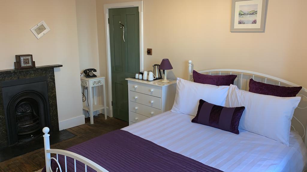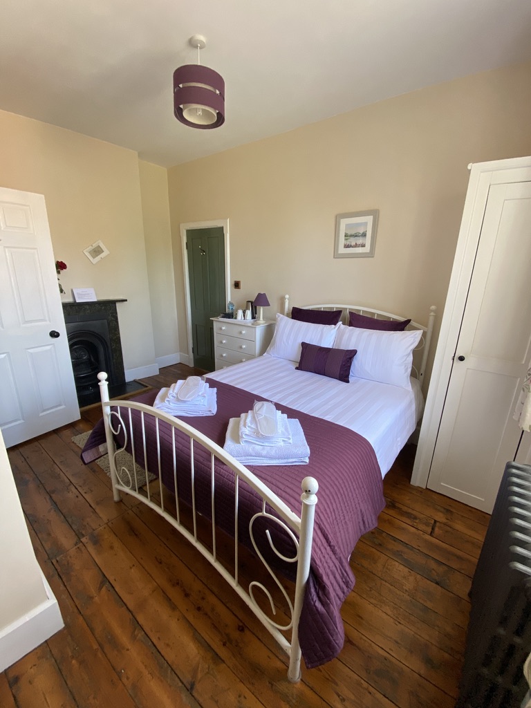 - The rooms theme colour is purple and pink, which runs through the curtains, bed throws, lamp shade and highlighted in the wall art.