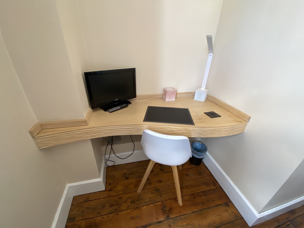 - Desk – A fitted desk has been made by a local cabinet maker. The desk is made from sycamore and has a curved front. The front of the desk is hand carved to give a ripple or bark effect and a hidden draw has been cut into the front. The desk finish is natural and waxed, we will let the wood age naturally.