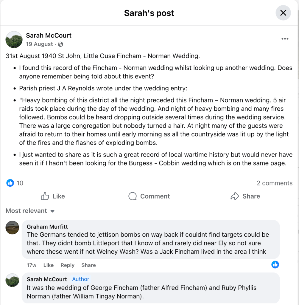 - Source, Fenland History on Facebook, Sarah’s Post – see comment below on bombing 31st August 1940, while a wedding being held in the Church.