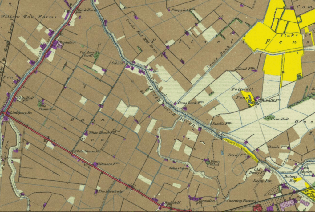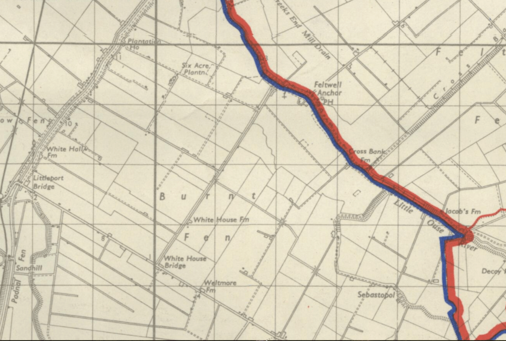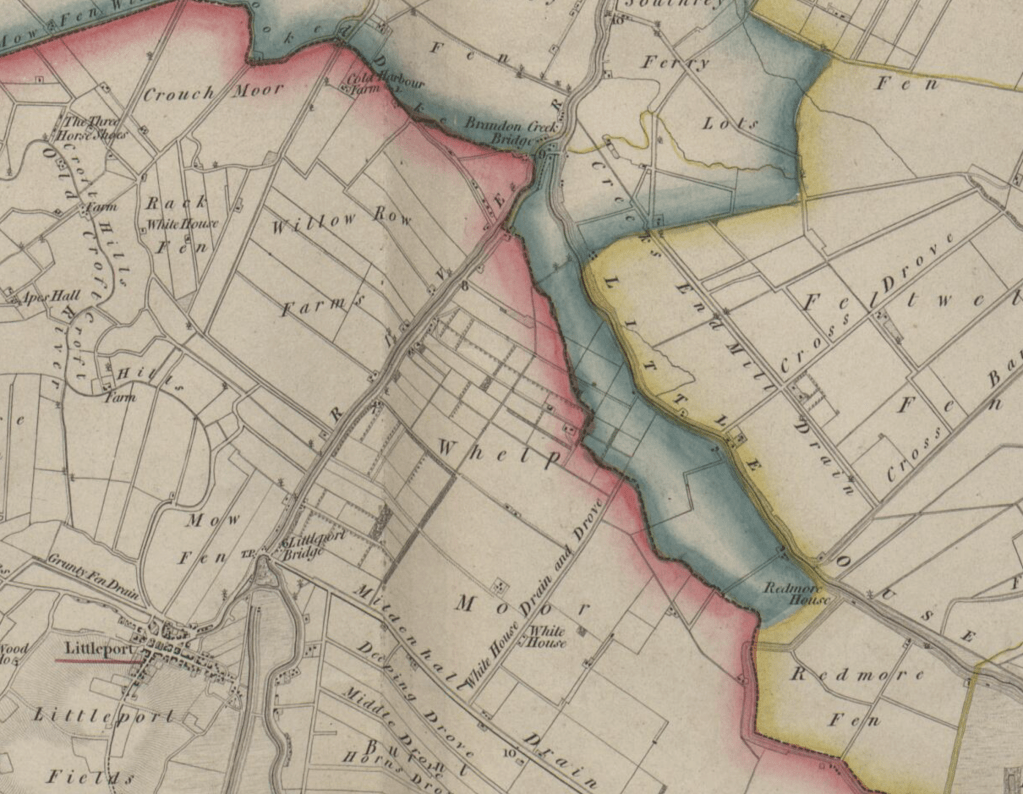 - The area of Little Ouse and White House Road is in Whelp Moor. In later maps this is renamed to Burnt Fen. Burnt Fen at the time of this map was the area on the other side of the Mildenhall Road. There does not appear to be a Mildenhall road, it is called Mildenhall Drain.