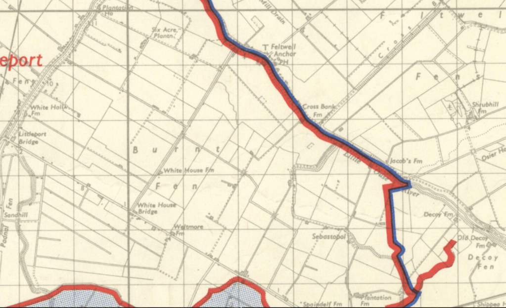 - In 1638 the local justices had information of a gathering of 600 men who were to meet in Whelpmore (now Wheltmore) Fen at ‘a foot ball play or camp, which camp should be called Anderson’s camp, who should bring an hundred strong with him’. Rain prevented this assembly, but 200 men, including some from Lakenheath across the Suffolk border, met the following day and threw down the Undertakers’ drainage dikes. They did not hurt any man’s person or goods. Six men in all were committed to jail as a result of these disturbances. Whelpmore was at that time common to Littleport, Ely, and Downham, and as late as 1782 there was considerable doubt as to where the boundary ran. One of the witnesses before an Exchequer commission, who was then 64 years of age, stated that as a child he had been rowed to a house called Lees Hill in a gunning boat. Farther east, the former extra-parochial place of Redmere, originally on the Norfolk but now on the Cambridgeshire side of the Little Ouse, was transferred in 1895 from the former to the latter county. It had at various times in its history been associated with Methwold and Hockwold in Norfolk and Lakenheath in Suffolk. In 1933 Redmere was abolished as a civil parish and absorbed into Littleport. Another change involving county boundaries took place in 1885, when a detached part of Hilgay (Norf.) was added to Littleport or to Southery according as it lay on the left or right bank of the Little Ouse.