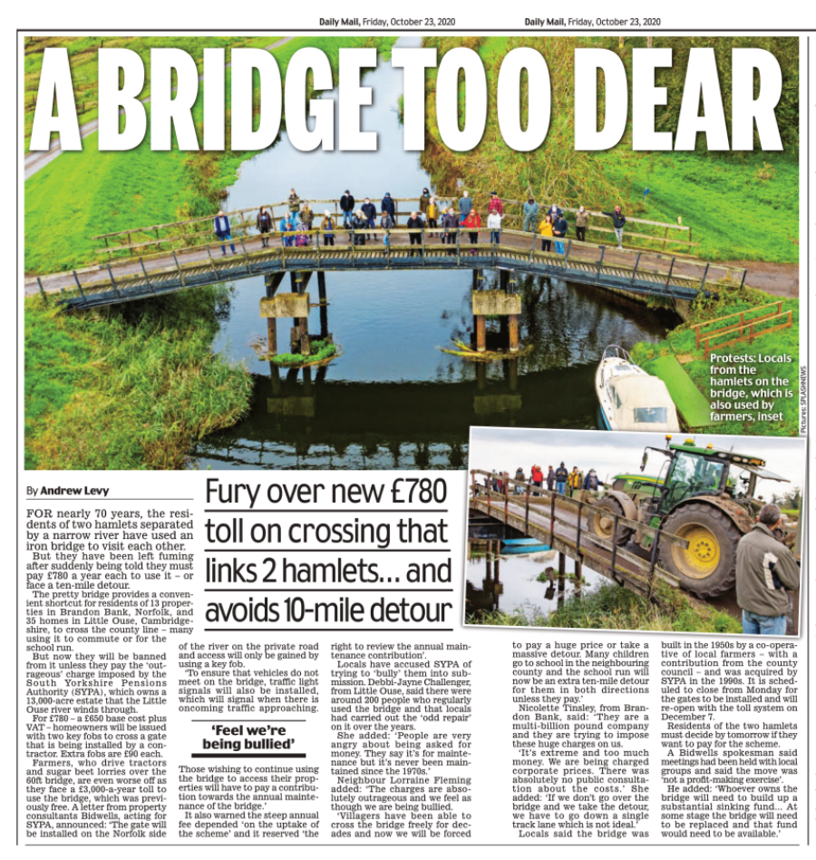 - 21st, Wednesday – BBC online – Little Ouse and Brandon Bank bridge row over £650 fee – People living in hamlets either side of a river could be asked to pay £650 a year to cross a bridge which has been free to use for decades. The owner of the bridge, which connects Little Ouse in Cambridgeshire and Brandon Bank in Norfolk, said it was “actively seeking a solution to how it is best maintained and repaired”. Residents were “very angry about being asked for this money”. The owners said: “This is very much not a profit-making exercise.” The iron bridge dates from the 1970s and is owned by the South Yorkshire Pensions Authority (SYPA) along with the surrounding Waldersey estate. Debbi-Jayne Challenger, of Little Ouse, estimated there were nearly 200 people in the vicinity who used the bridge, including farmers, who carried out the “odd repair”.