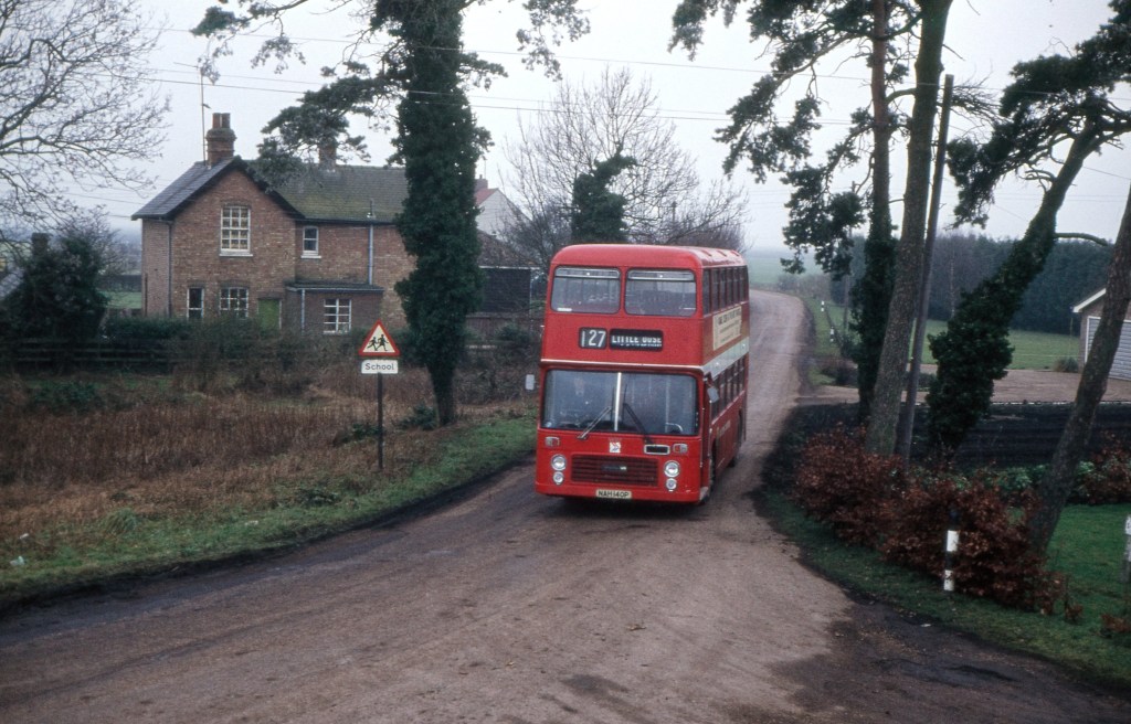 To the left the schools sign is still standing, this was removed after the school was closed. Between The Old School House and the red bus, you can see the corner of a half-timbered building poking out. This was the School house (since demolished, see the entry for 1927, showing the area it occupied). It would be good to know the date after February 1984, when it was demolished and the actual closing date of the school?