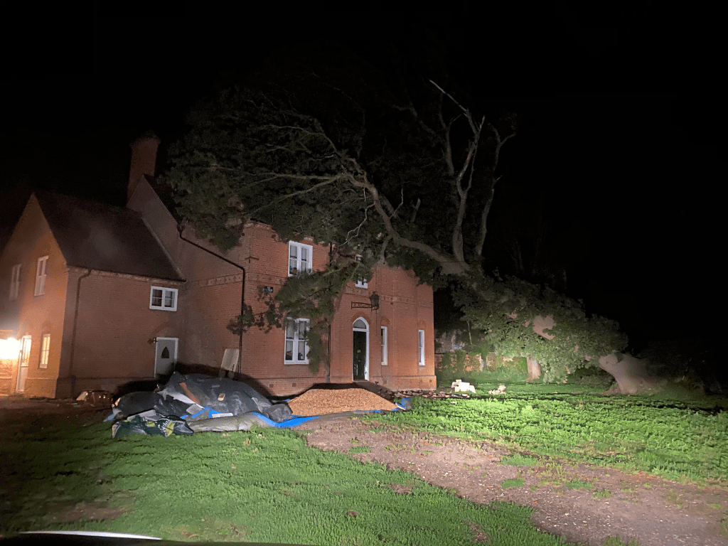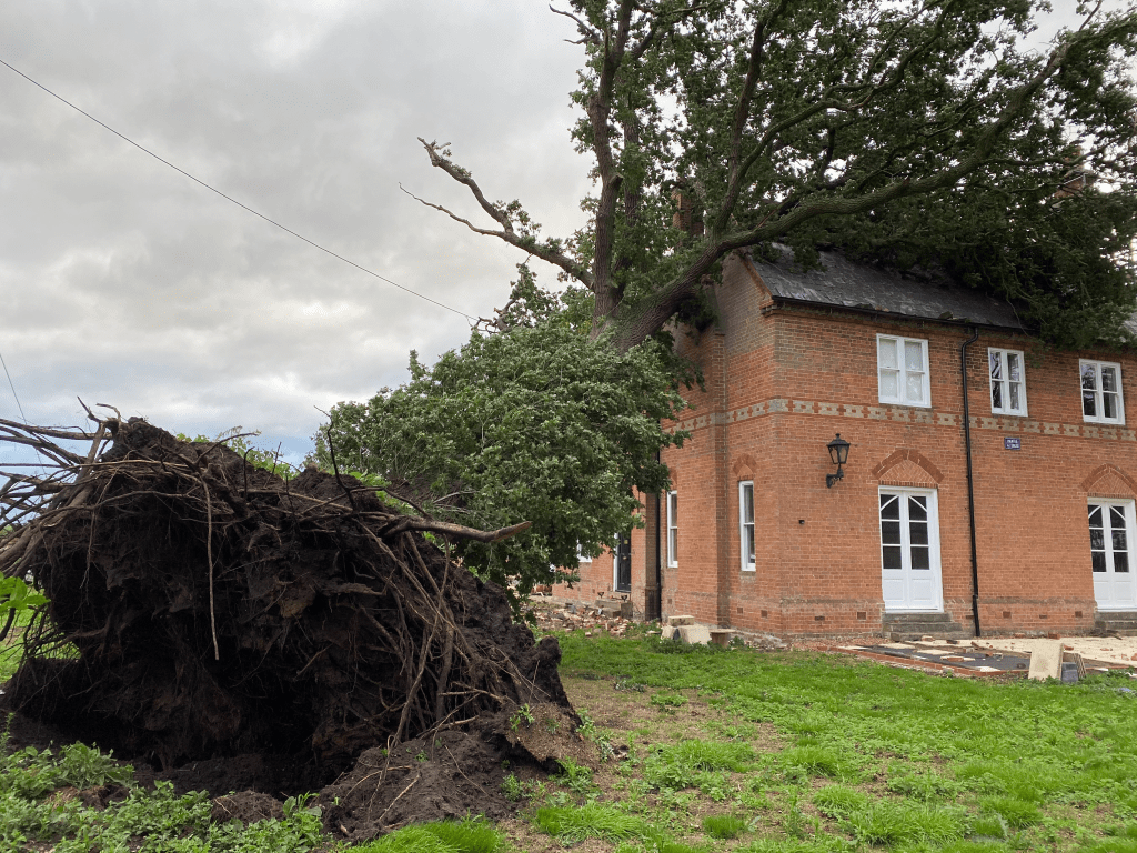 During the night a summer storm brought down a one hundred and fifty year old oak trees that stood in The Old Vicarage garden. Although close to the house, this tree had been reviewed by tree surgeons during annual maintenance since 2015 as being safe and was declared “It will last as long as the house”. During the night it nearly proved that true when at least twenty-five tons of oak tree hit the gable end of The Old Vicarage. The engineers declared that it would have gone through a new build house like a cheese wire, there would have been nothing left! However, The Old Vicarage was over-engineered by the Victorian’s, being six bricks thick in places, plus roof beams twice the expected size. As a result the damage looked far worse than it was. One gable end and three two stack chimneys were rebuilt, plus most of the slates were replaced on the roof.