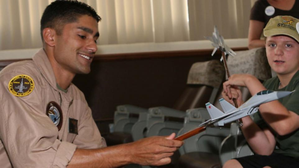 Photo by Cpl Aubry Buzek in 2009. Then Captain (now Major) Taj Sareen, a Marine Fighter Attack Squadron 323 F/A-18 pilot, shows Jared Hyams the model fighter jets they use during briefs. The Make-A-Wish foundation granted Hyams his wish to attend the 2009 (Image: Archant)