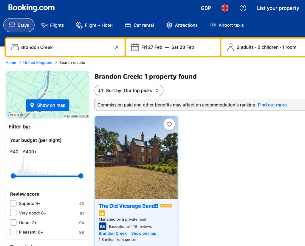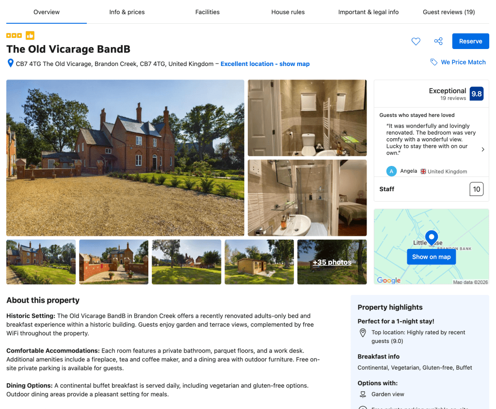 Although The Old Vicarage is located in Little Ouse, the address tool in Booking.com lists it as Brandon Creek.