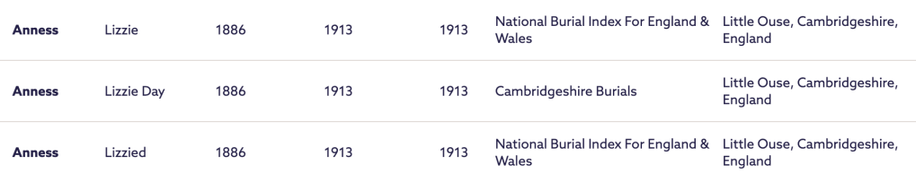 - Sources – Cambridgeshire Burials, National Burial Index For England & Wales – birth years different in sources