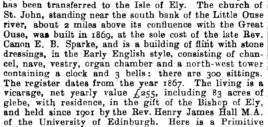 - The church of St. John is in the Early English style, of flint, with stone dressings, having chancel, nave, vestry, organ chamber and tower with bells and clock, and was built at the sole expense of the late Rev. Canon E. B. Sparke: it is situated on the south bank of the Little Ouse river, about 2 miles above its confluence with the Great Ouse. The register dates from the year 1868. The living is a vicarage, value about £300 yearly, in the gift of the Bishop of Ely.