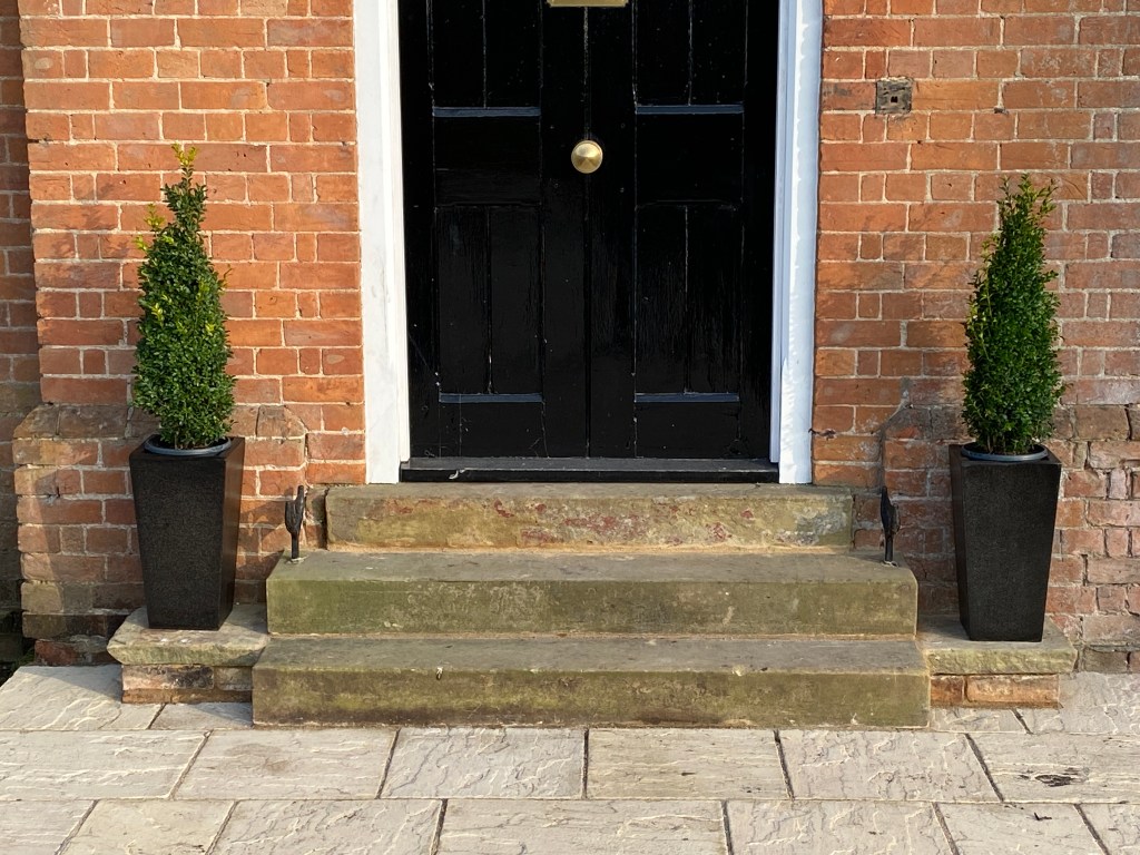 The front door sandstone steps had sunk. These have been lifted a new foundation added and they were then relaid. An addition to the side of the steps, two small sandstone platforms were created from a piece fo sandstone reclaimed from the house. The left hand one house inside it the new waste pipe from the new master ensuite. On top of these platforms a shrub tub has been added.