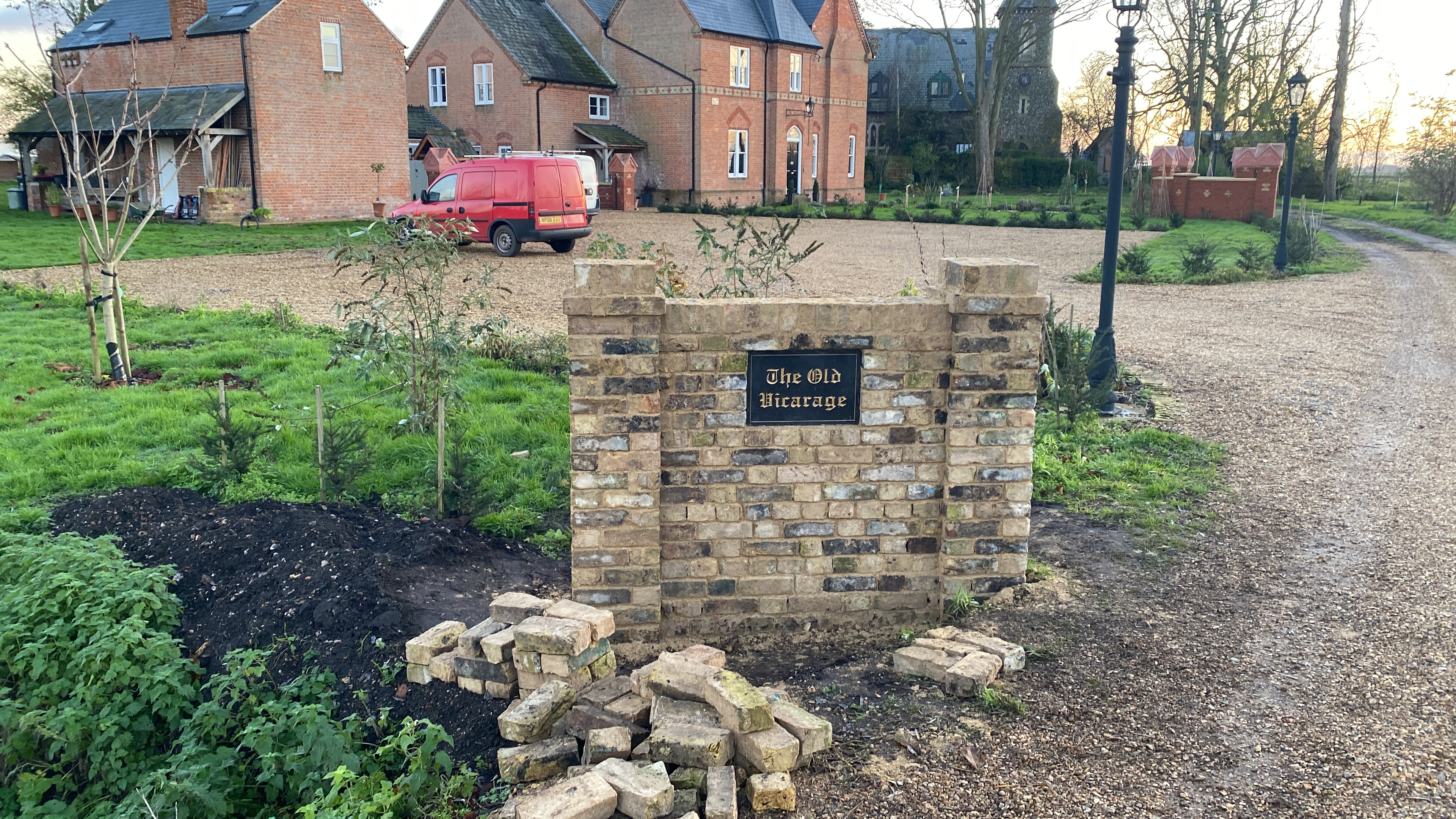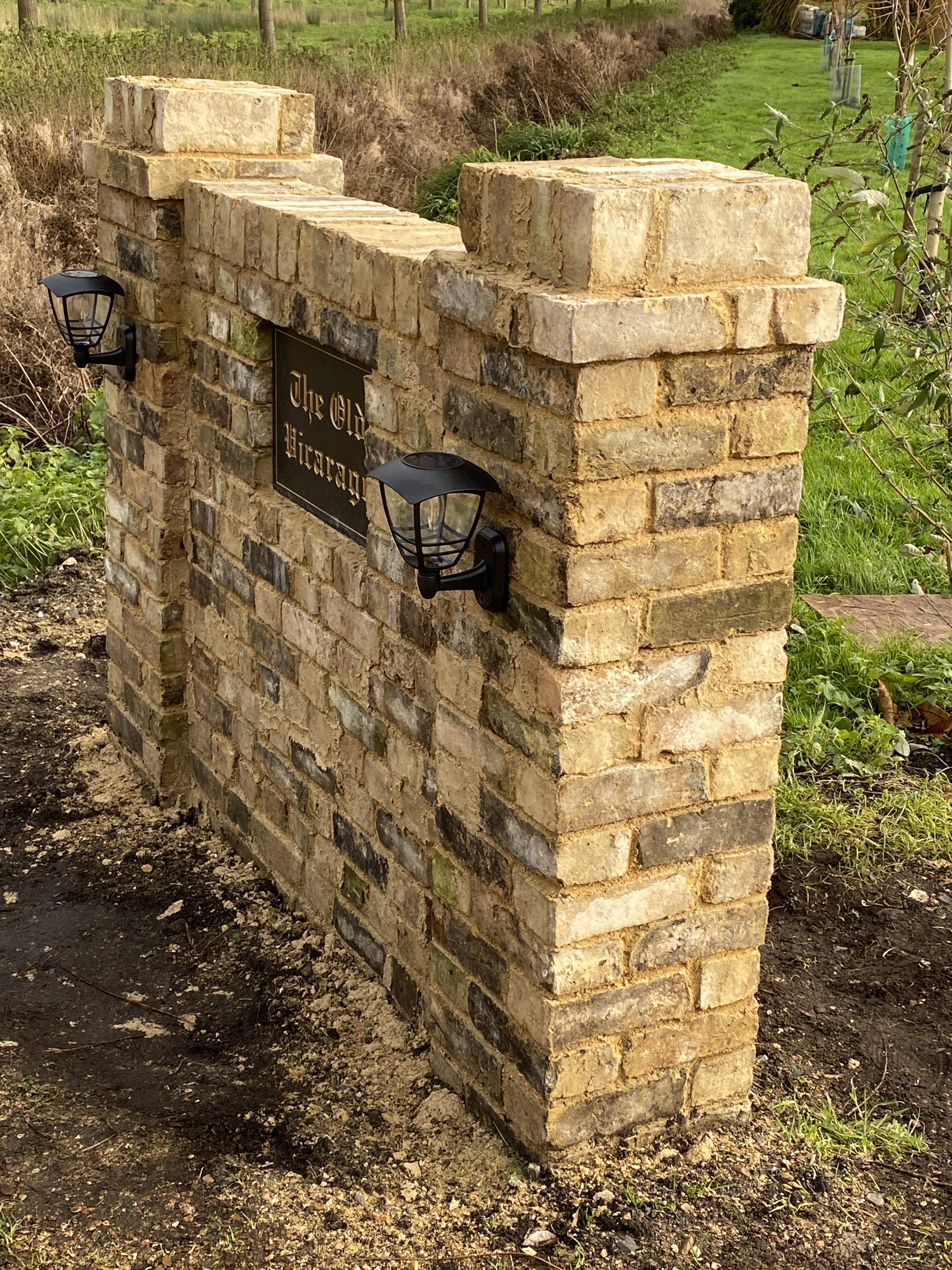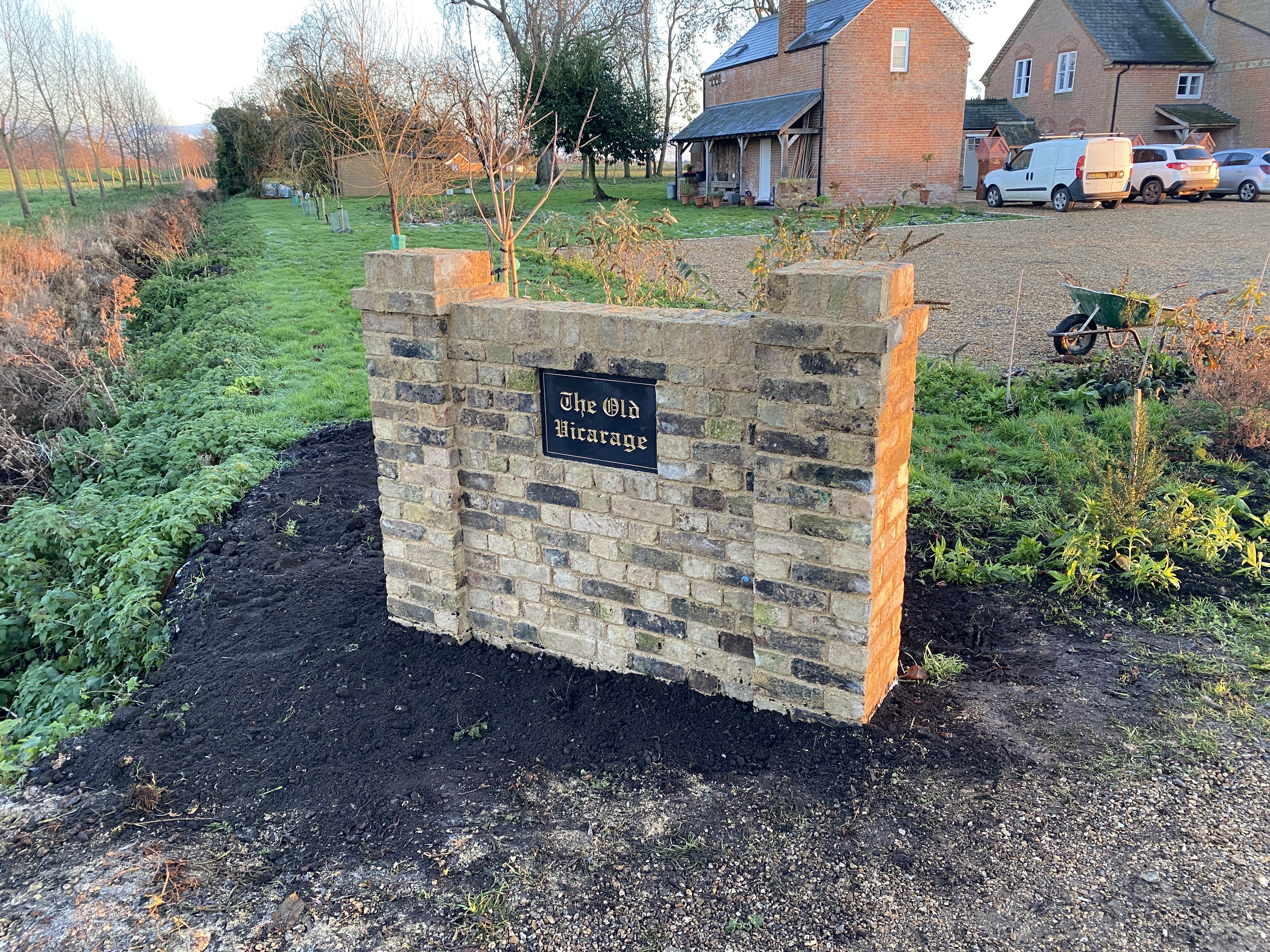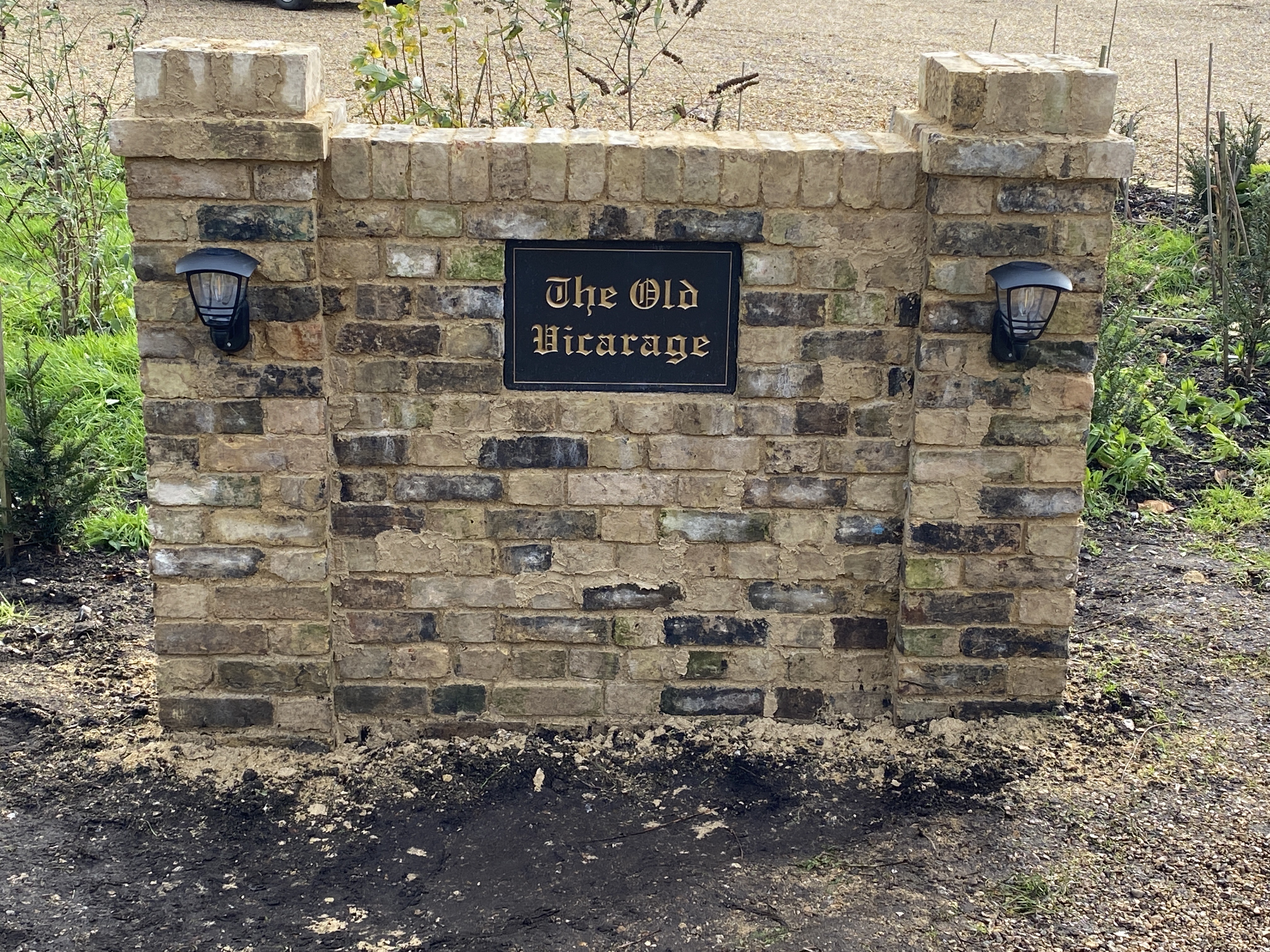 To the left of the front garden a twenty plus car park has been made. A slate sign was ordered and a wall created to accommodate it. All of the bricks used were reclaimed from the stable floor which were lifted and of course set in a lime mortar mix.
