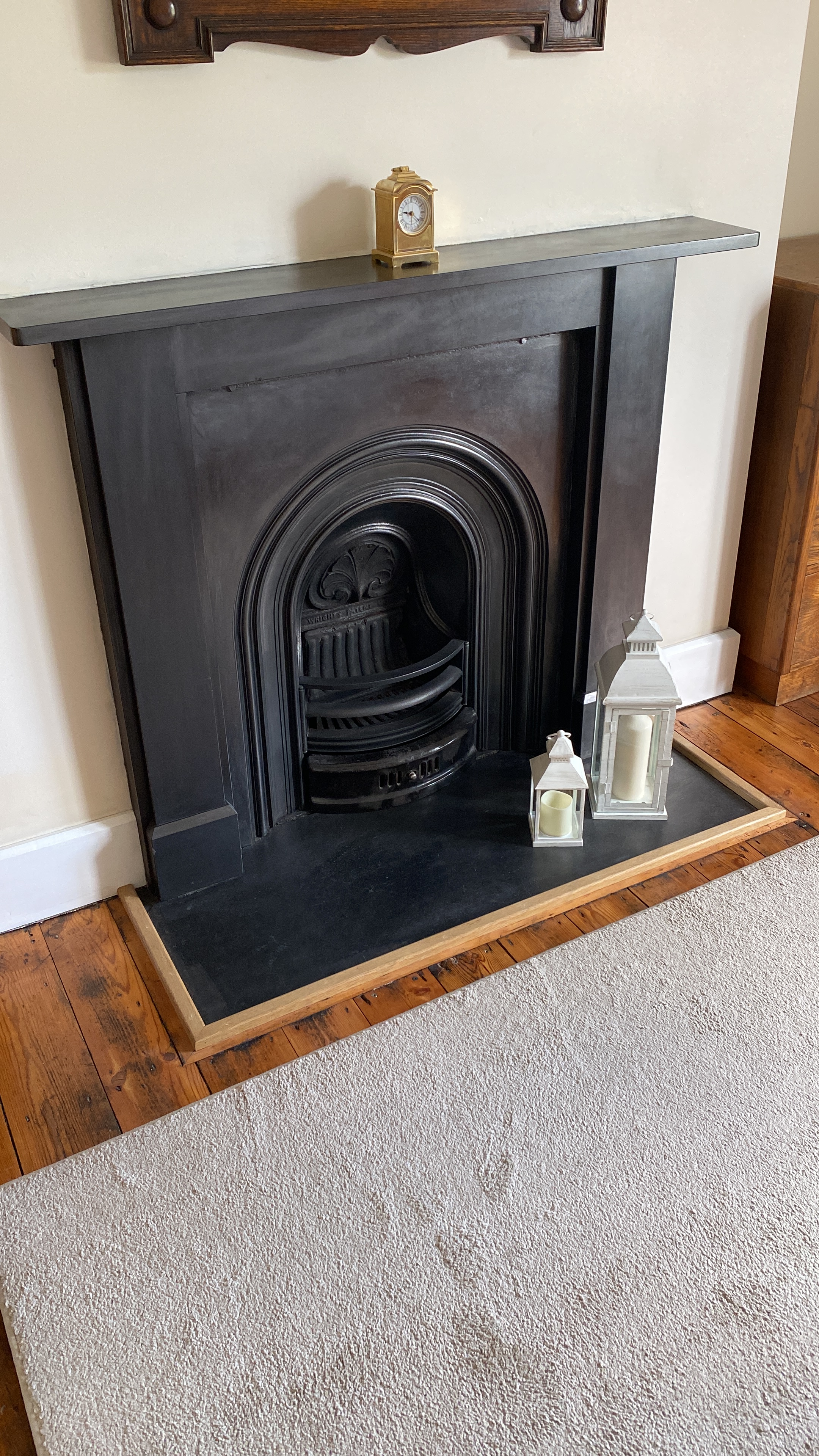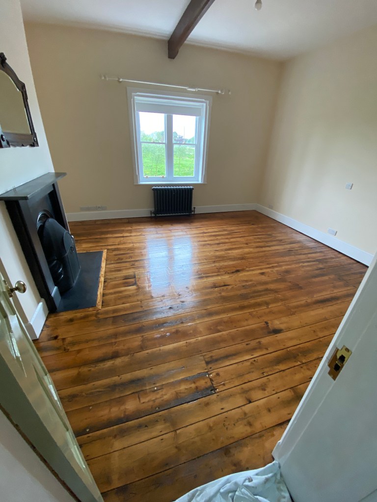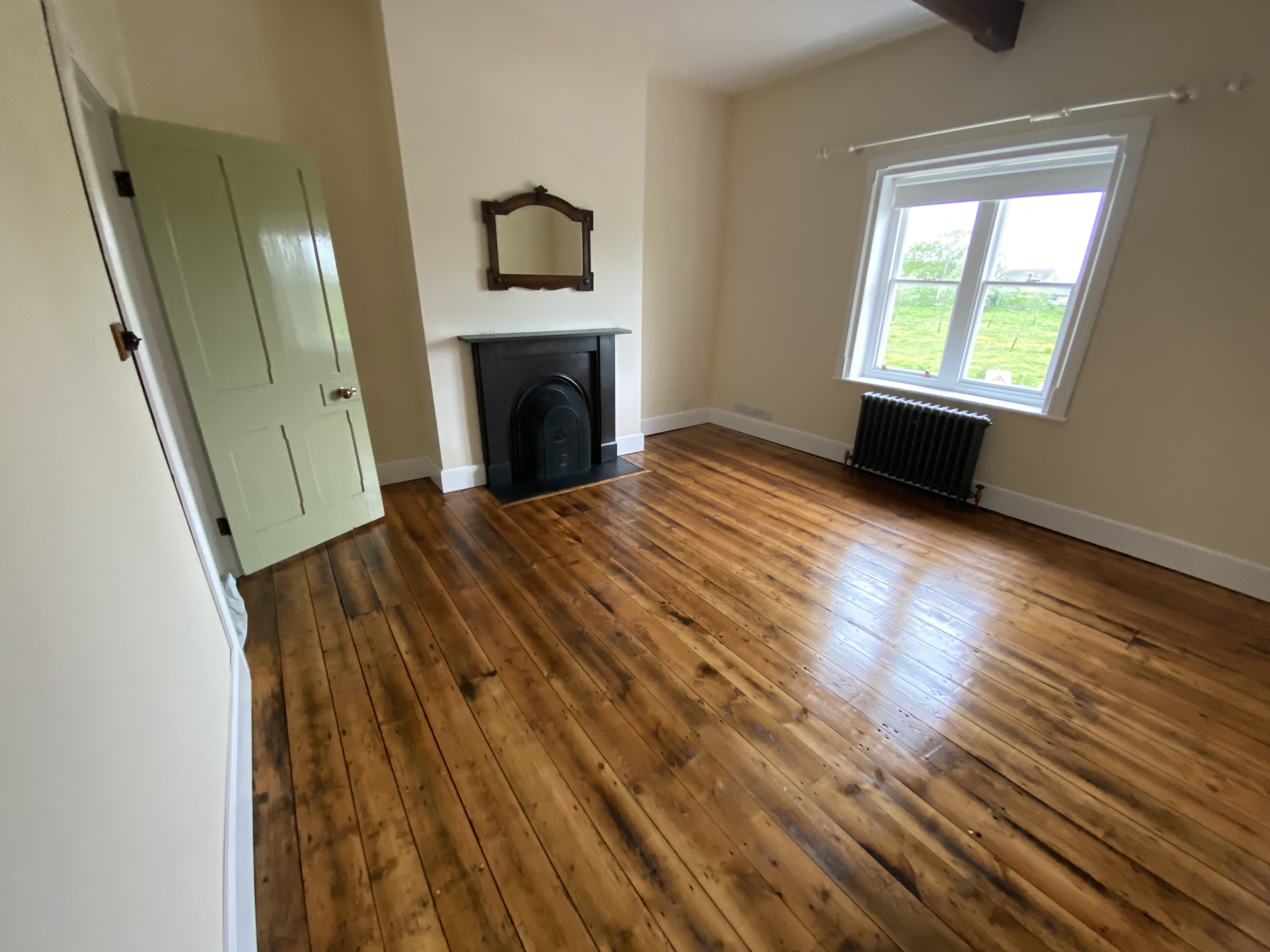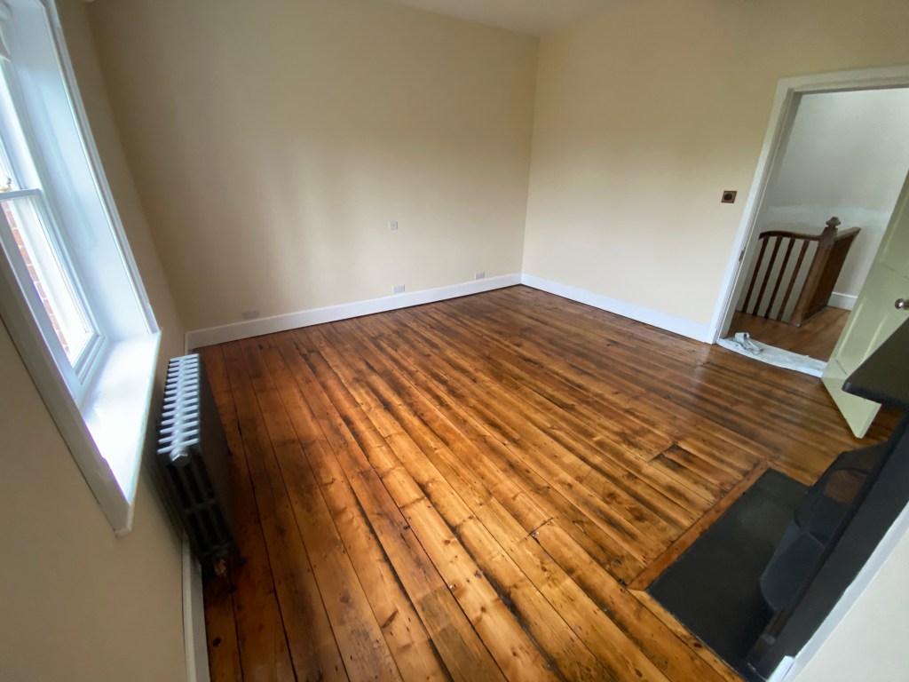 Floor waxed. originally this room had a connecting door to the master ensuite and master bedroom. This was in the acove to the right of the fireplace. This has now been sealed. However, the door frame has been left behind the plasterboard panel. This means that, if necessary, it could be opened up again in the future if required.