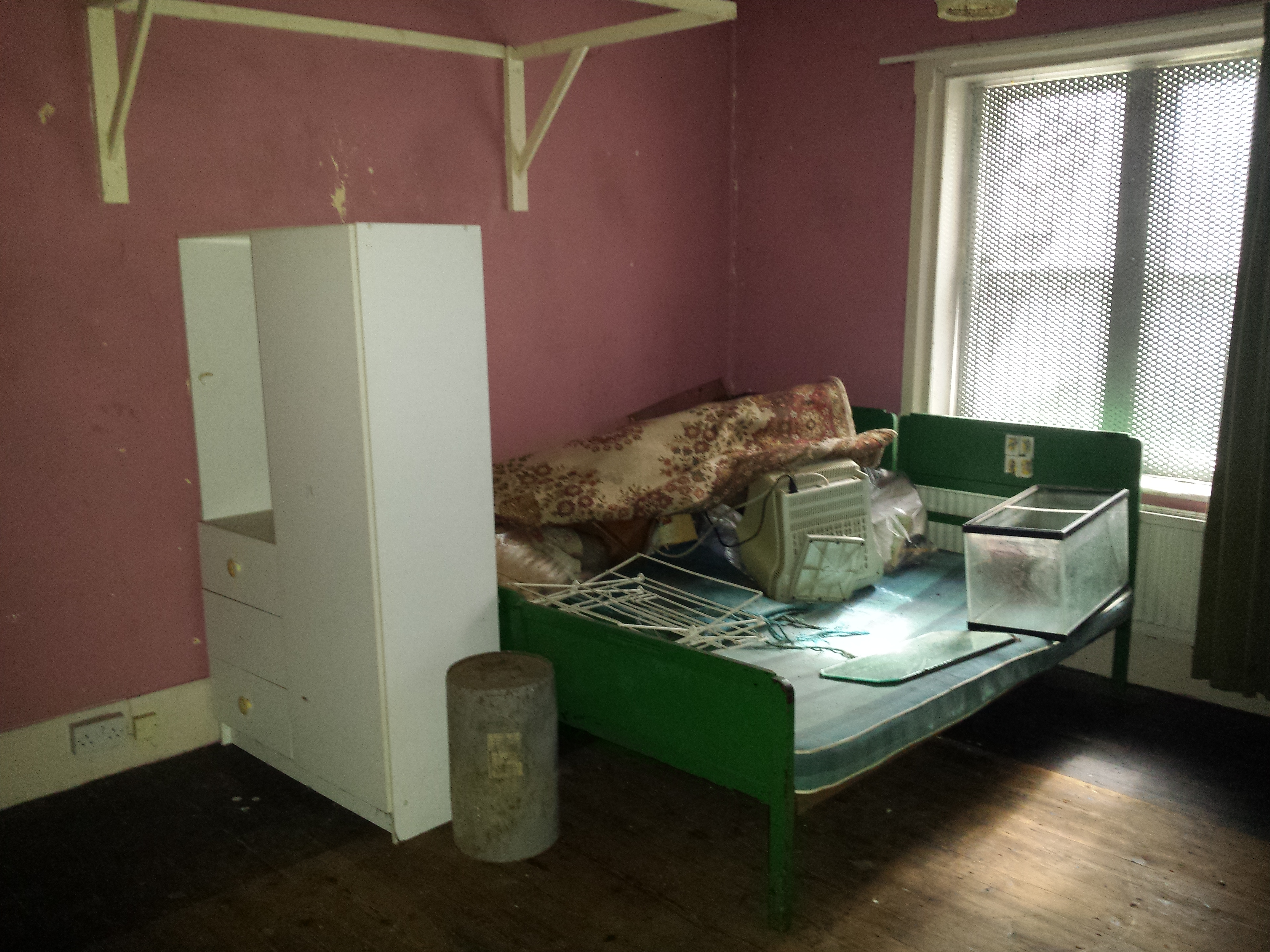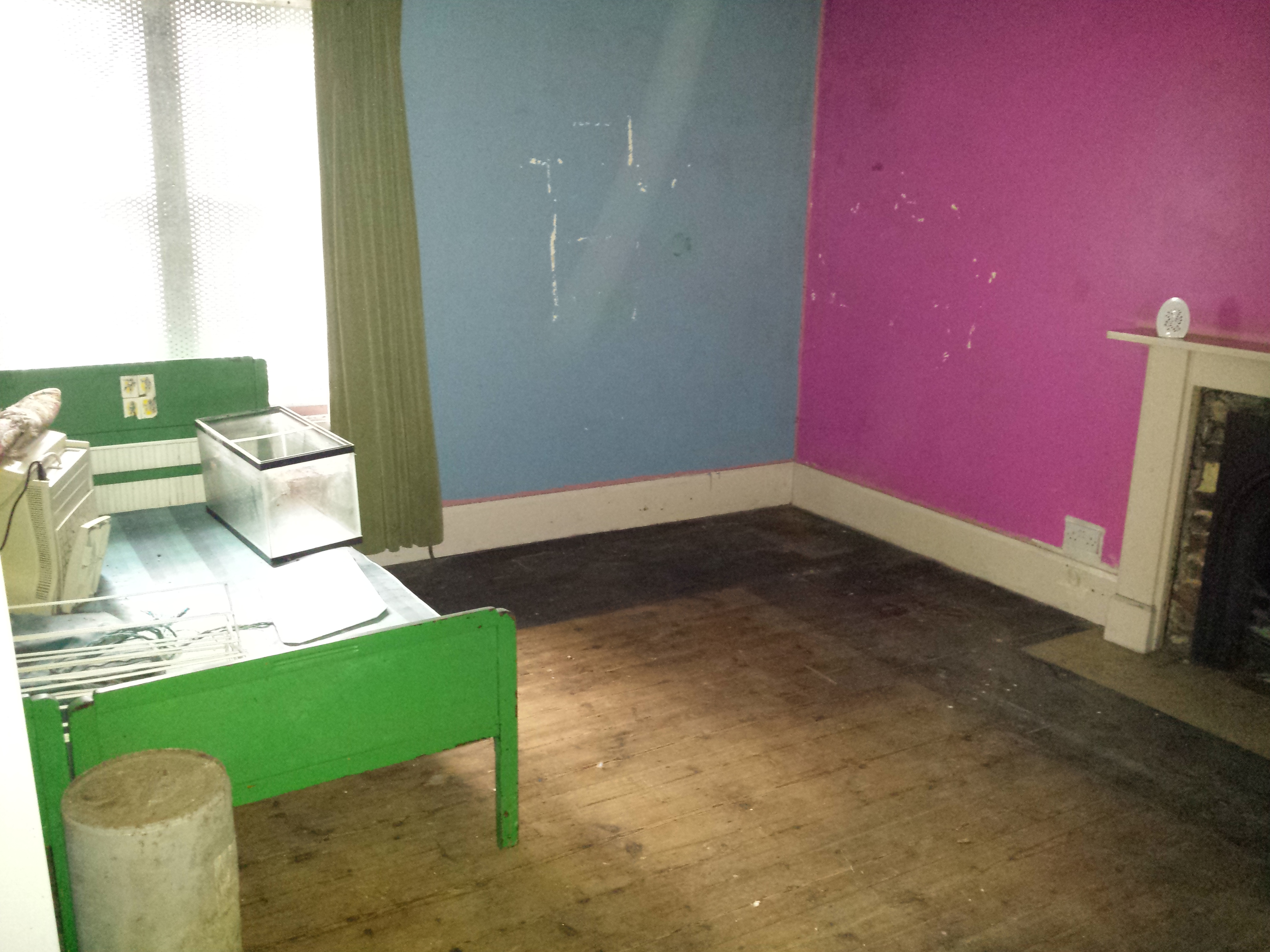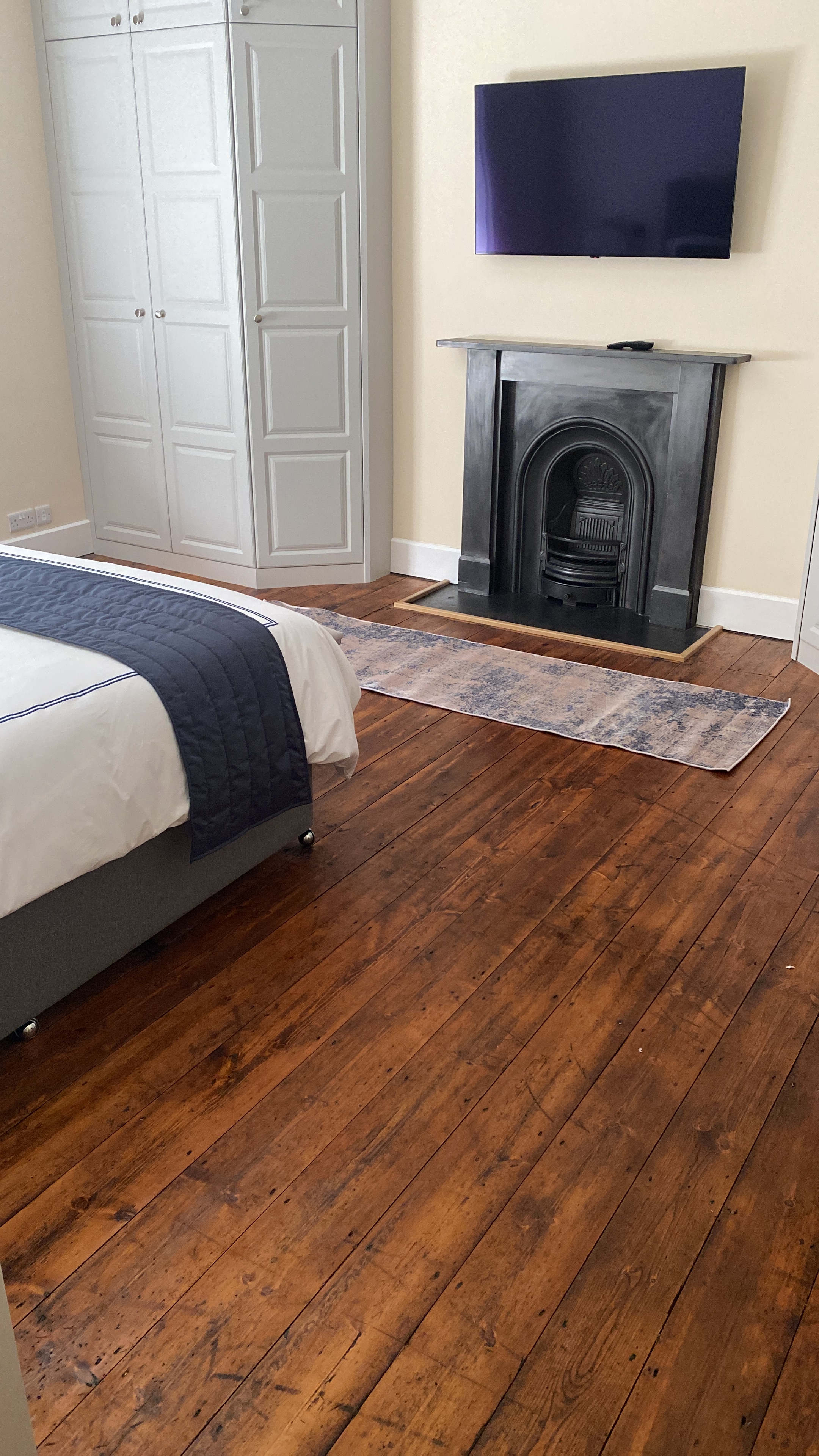 The following pictures show the transition of the master bed area. The floorboards at some point had been stained around a rug. This of course meant that a light sanding on these areas had to take place to match them into the rest of the floor before they could be hard waxed.